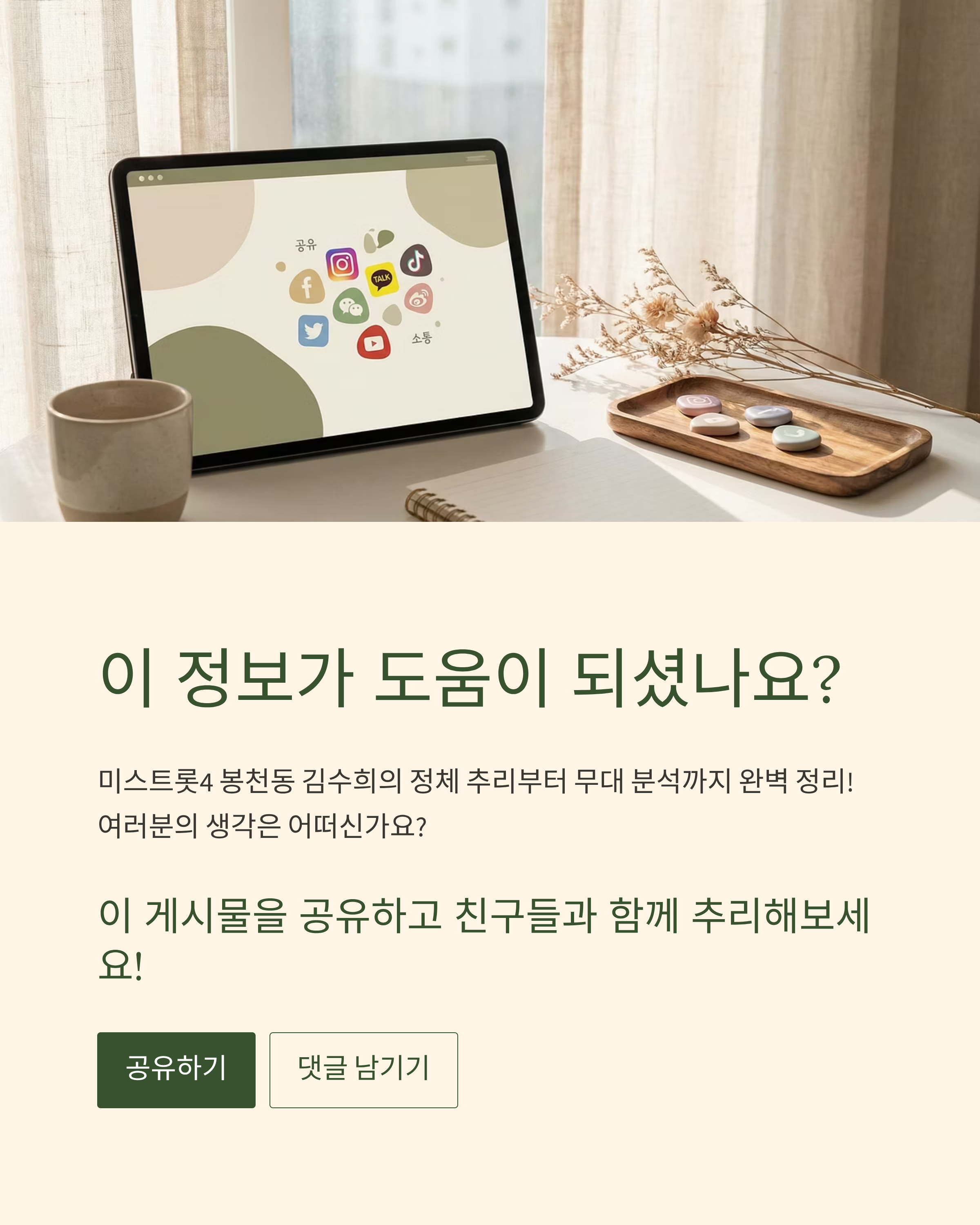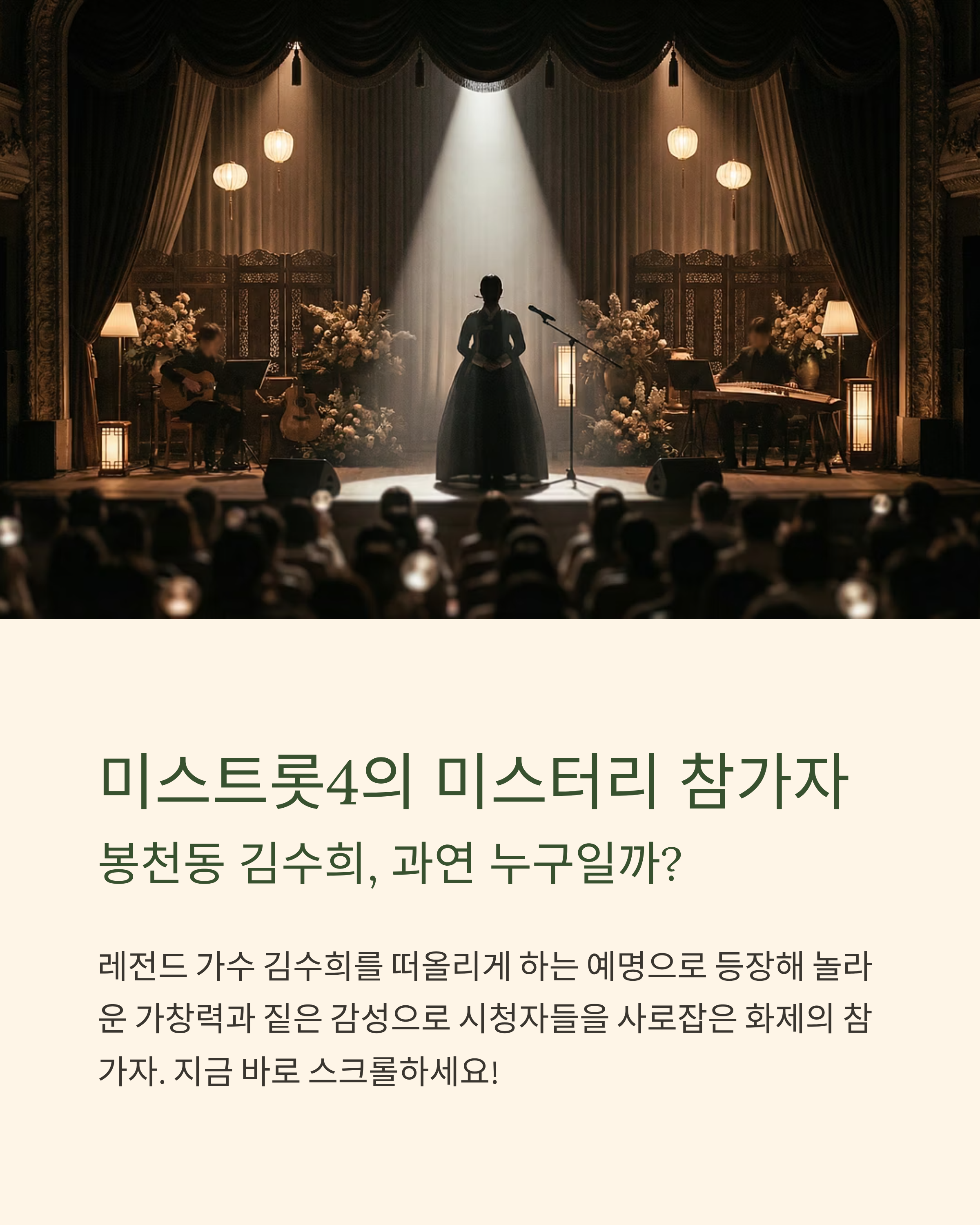 TV조선 인기 트로트 오디션 프로그램 **‘미스트롯4’**가 뜨거운 화제를 모으고 있는 가운데, 방송 초반부터 강력한 화제성을 몰고 온 참가자가 있다. 바로 **‘봉천동 김수희’**라는 예명을 사용한 미스터리 참가자다.