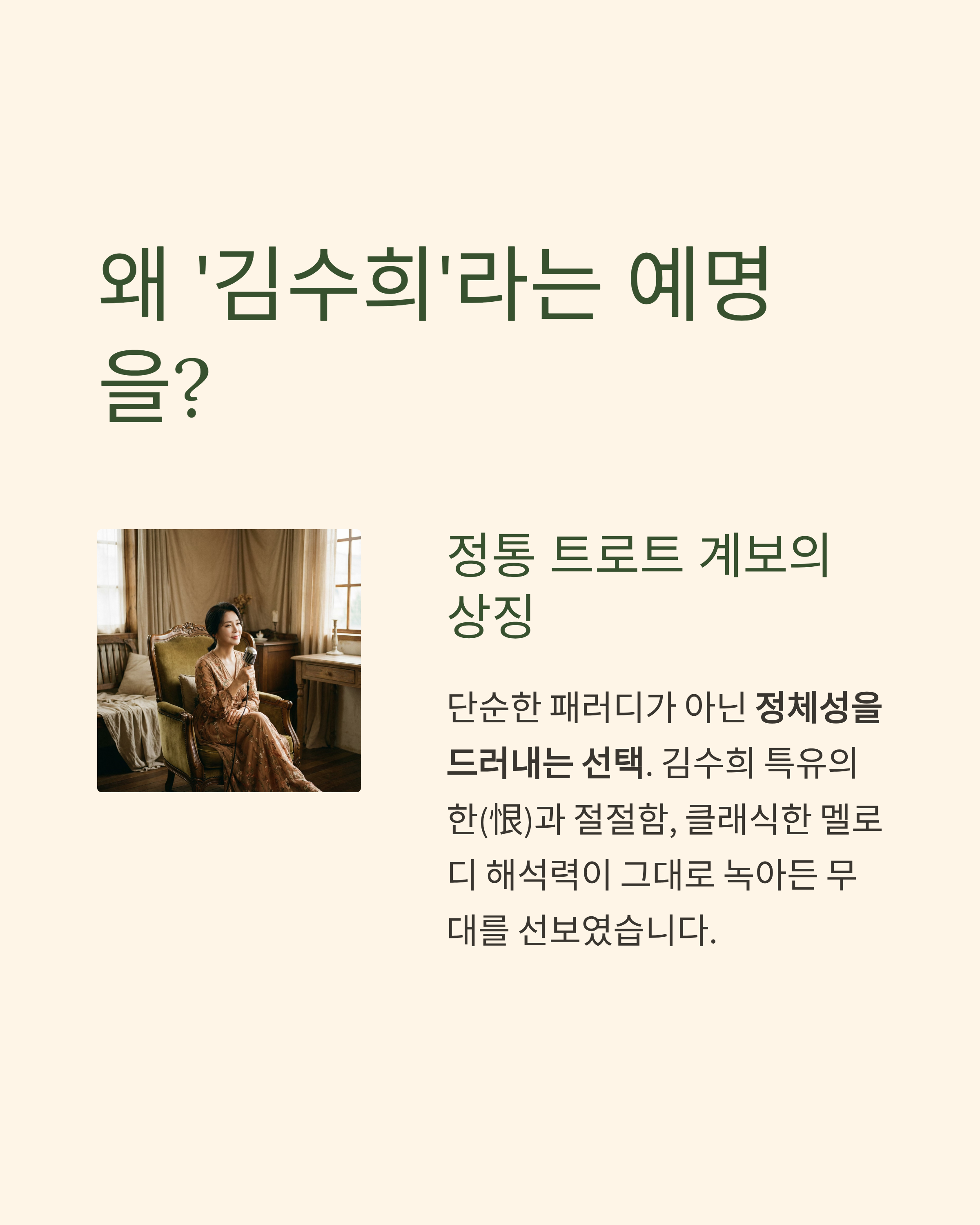 ‘정통 트로트 계보를 잇는 감성 보컬’이라는 정체성을 드러내는 상징적 선택이다.