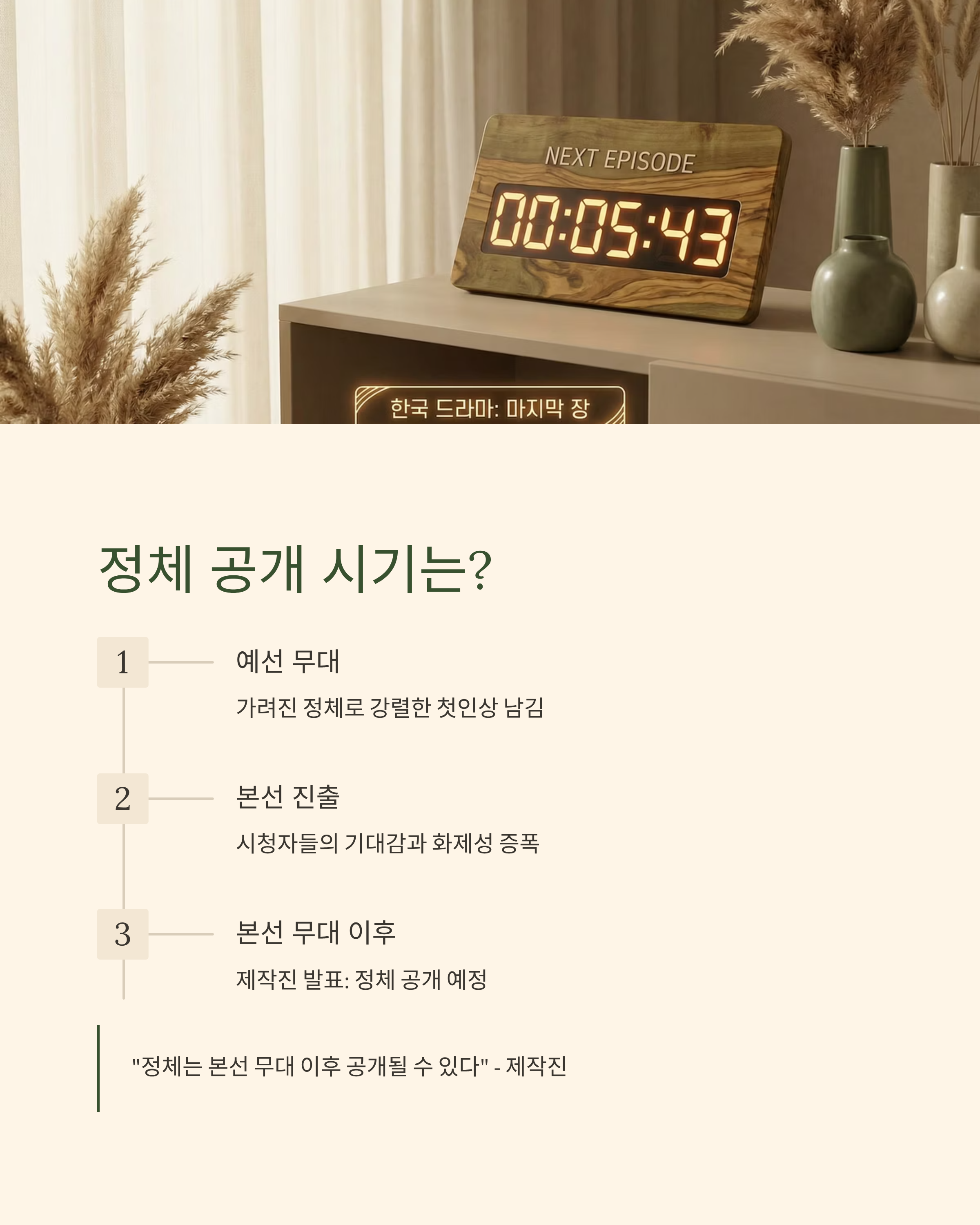 A. 네, 제작진은 본선 이후 정체 공개 가능성을 언급했으며, 시청자들의 기대감을 더욱 증폭시키고 있습니다.