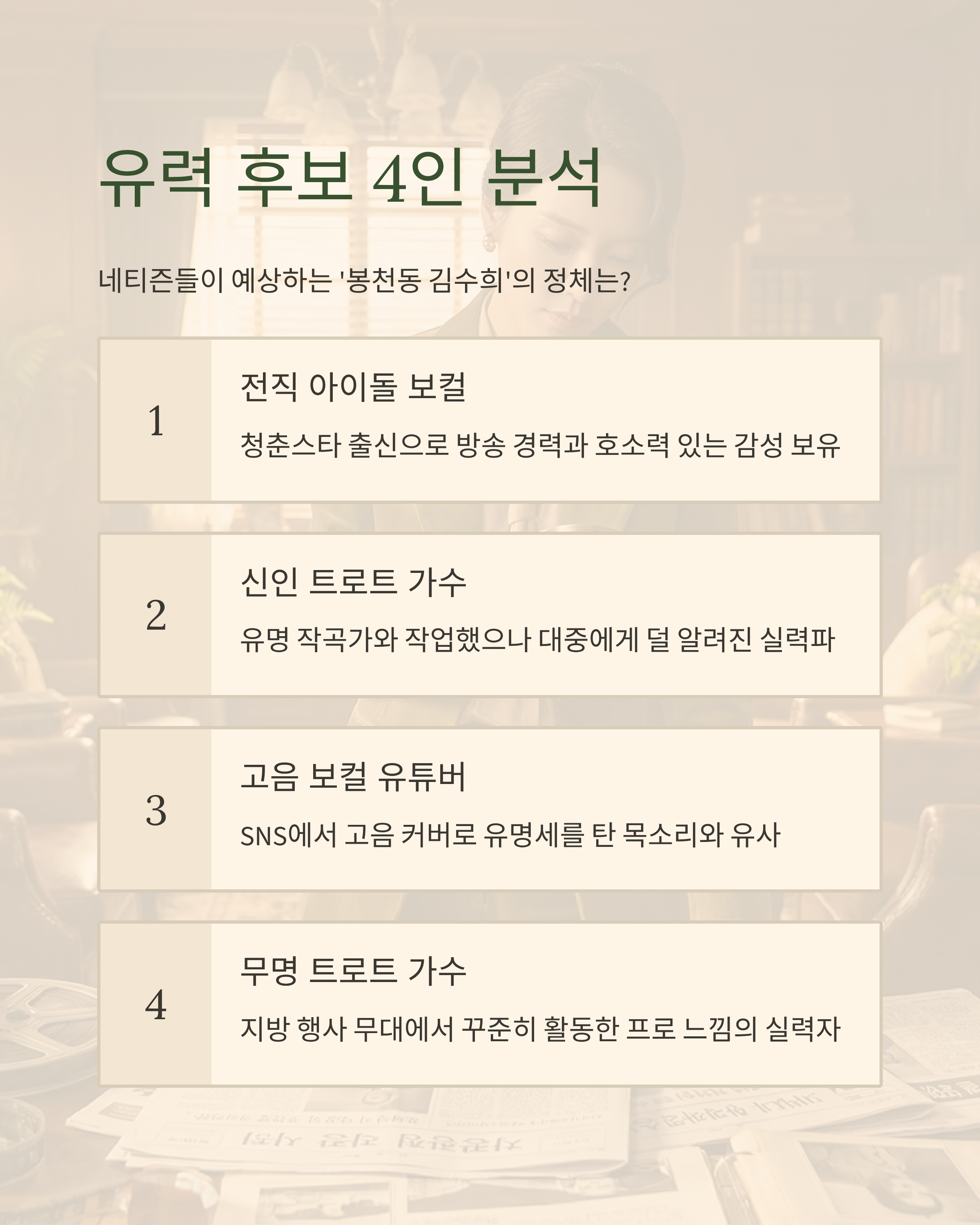 그렇다면 과연 ‘봉천동 김수희’는 누구일까? 현재 온라인에서 거론되는 유력 인물 후보들, 정황 분석, 그리고 출연자의 스타일을 통해 예상해본다.