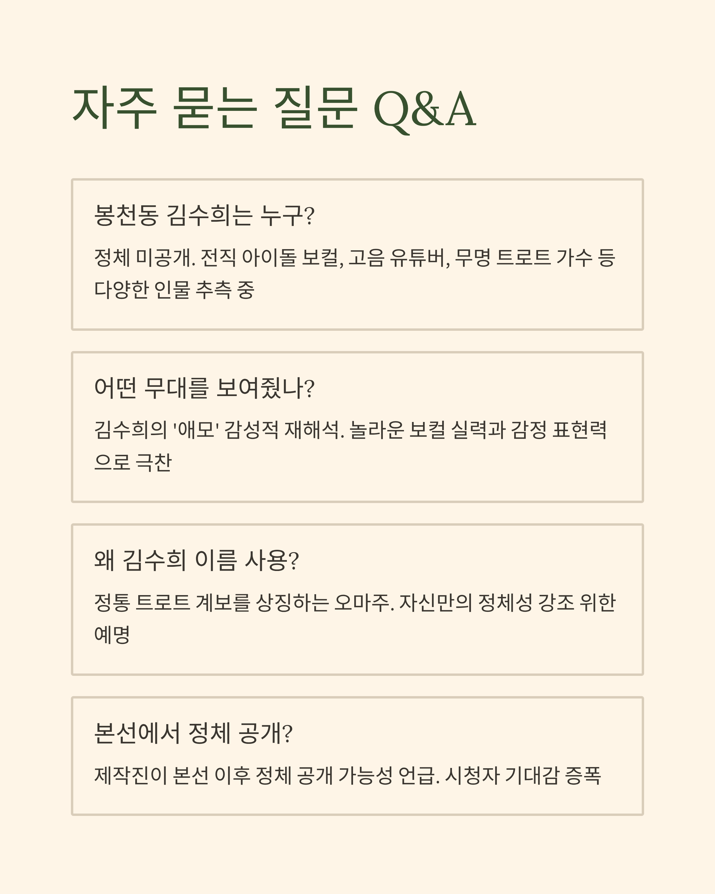 그만큼 ‘봉천동 김수희’의 존재는 단순한 참가자 이상의 화제성과 기대감을 만들어내고 있는 셈이다.