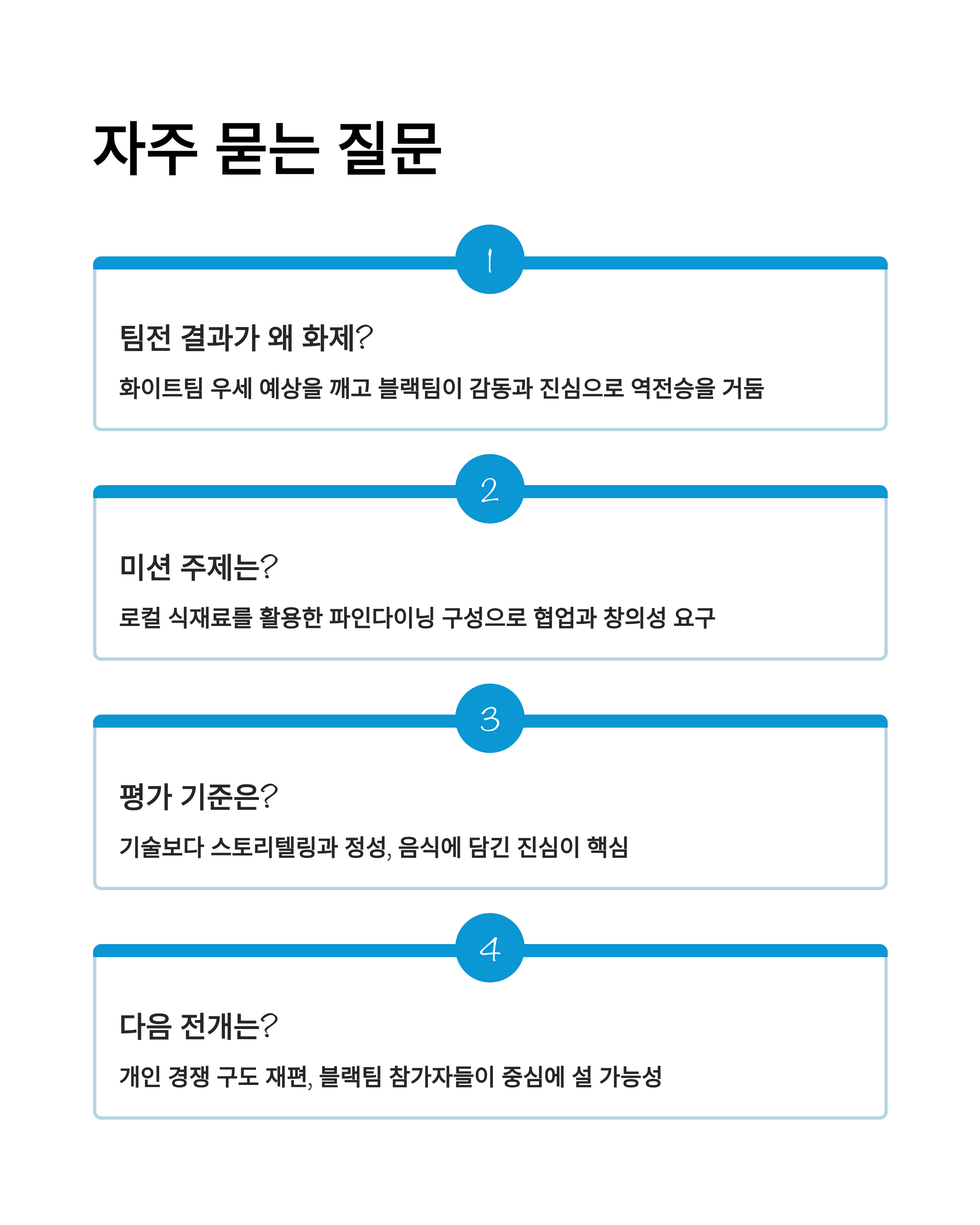 - 의외로 블랙팀이 감동적인 스토리와 맛으로 역전승을 거두며 극적인 마무리!