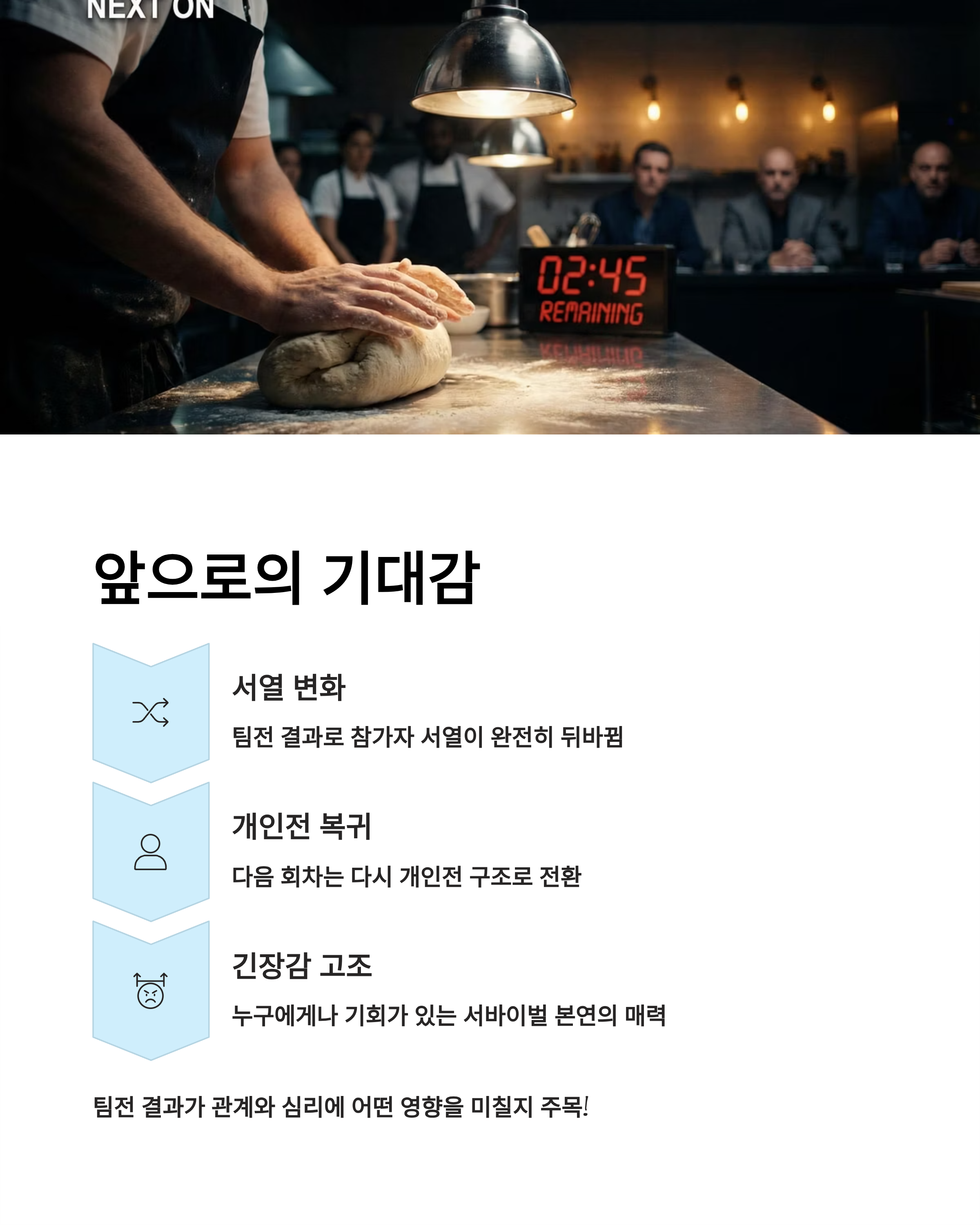 팀전 결과로 인해 참가자들의 서열이 뒤바뀌었고, 시청자들도 "이제 누구에게나 기회가 있다"는 서바이벌 본연의 긴장감을 느끼고 있다.