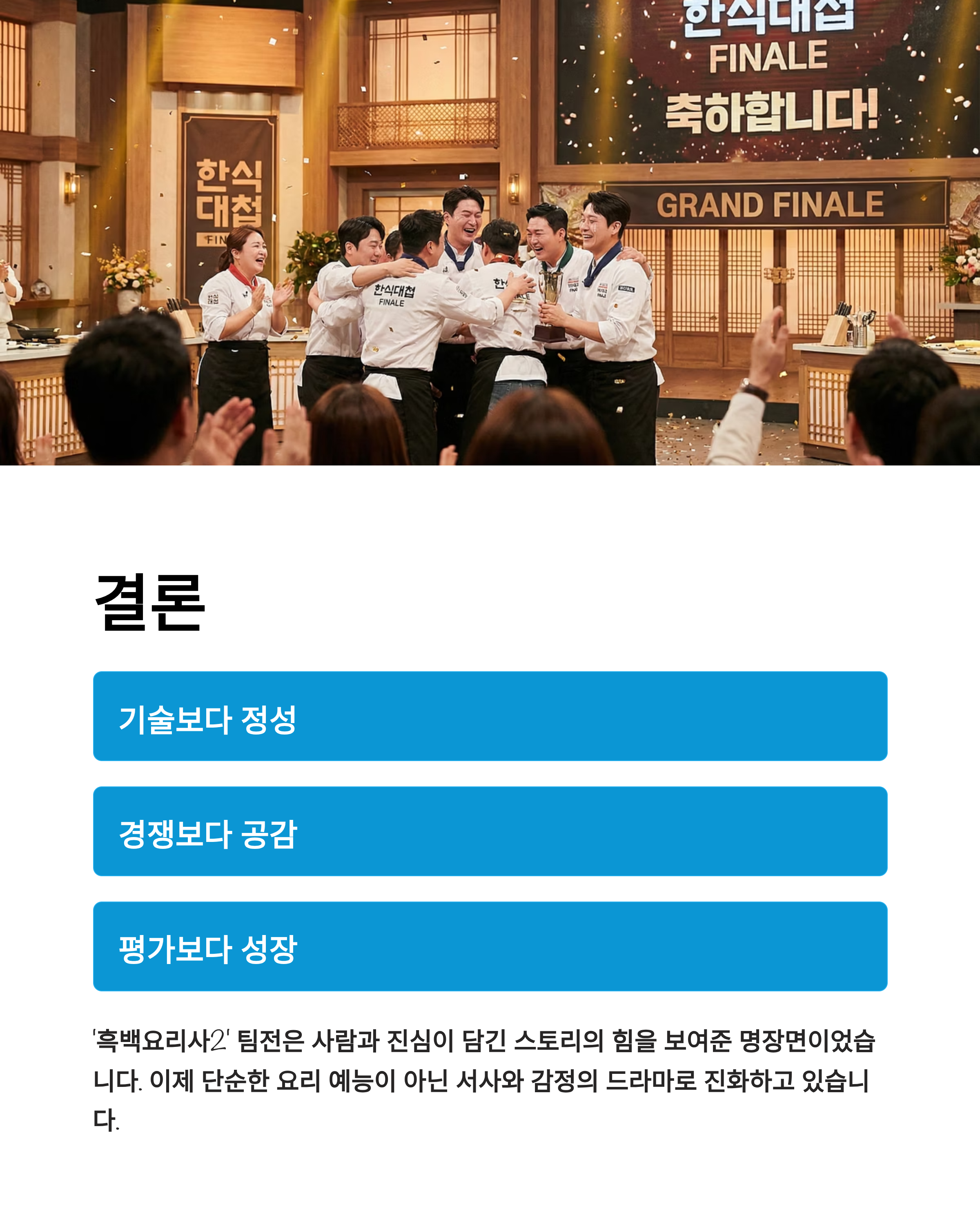 기술보다 정성, 경쟁보다 공감, 평가보다 성장을 중심에 둔 이번 결과는 앞으로의 전개에 더 큰 기대를 품게 한다.