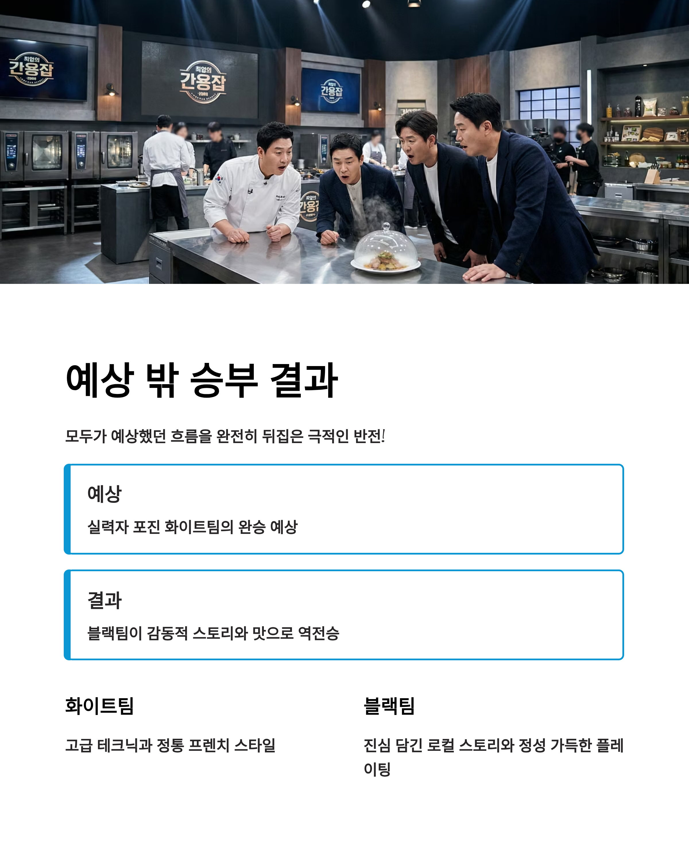 A. 실력 위주의 화이트팀이 우세할 것이라는 예상을 깨고, 감동과 진심으로 요리한 블랙팀이 승리하는 반전이 펼쳐졌기 때문입니다.
