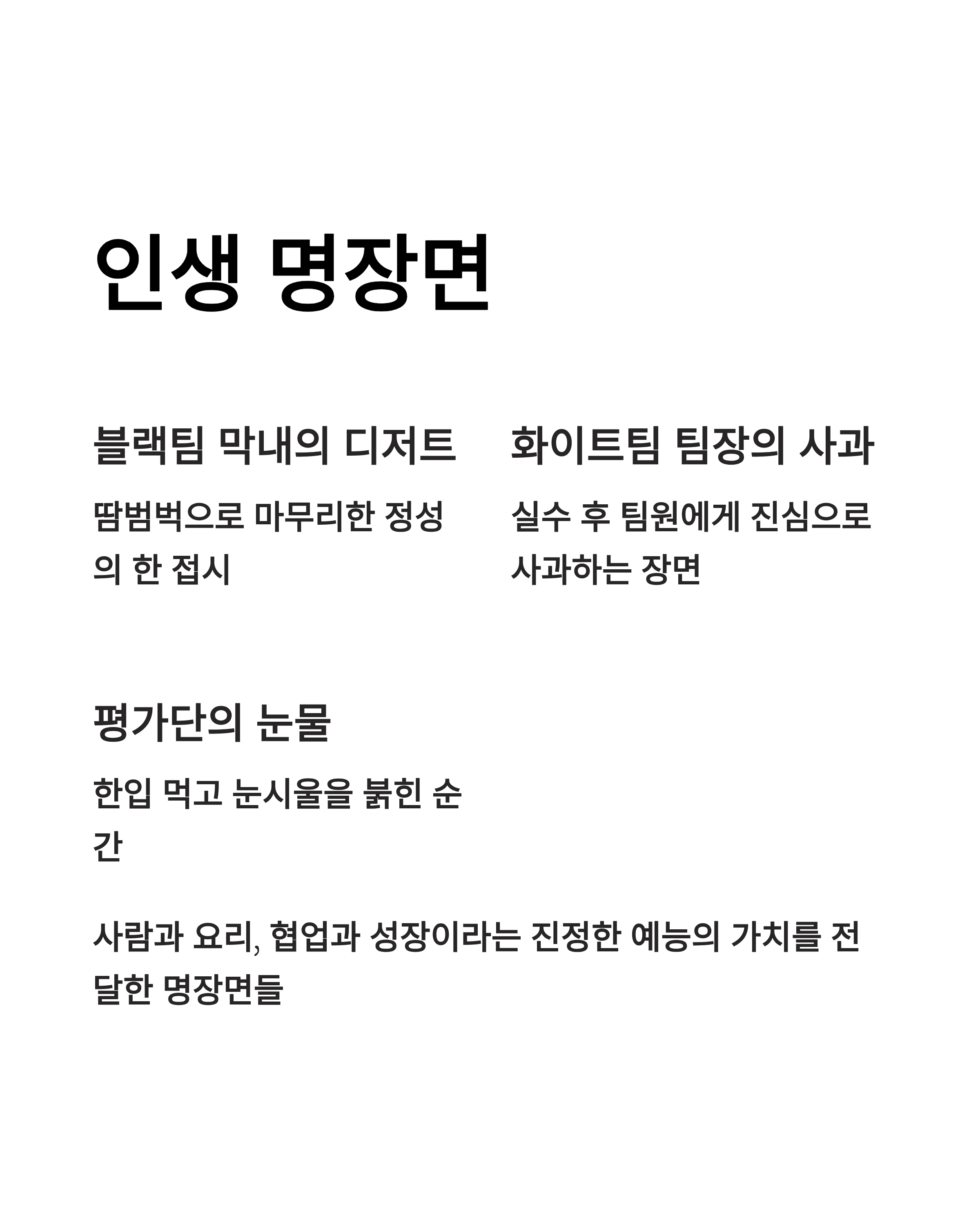 ‘흑백요리사 시즌2’ 팀전 미션은 단순한 요리 배틀을 넘어, 사람과 진심이 담긴 스토리의 힘을 다시금 느끼게 해준 명장면이었다.