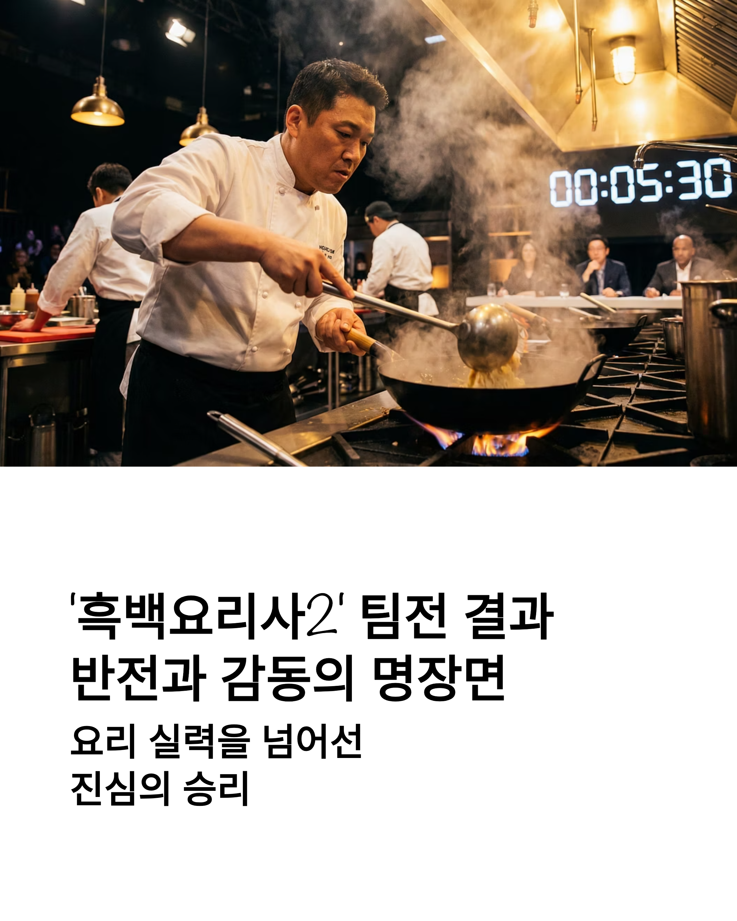 요즘 예능과 요리의 결합이 유행인 가운데, **쿠킹 서바이벌 예능 <흑백요리사 시즌2>**가 화제다. 그 중에서도 최근 방송된 팀전 미션 결과가 시청자들 사이에서 뜨거운 감동과 반전의 중심에 서며 커뮤니티를 달구고 있다.