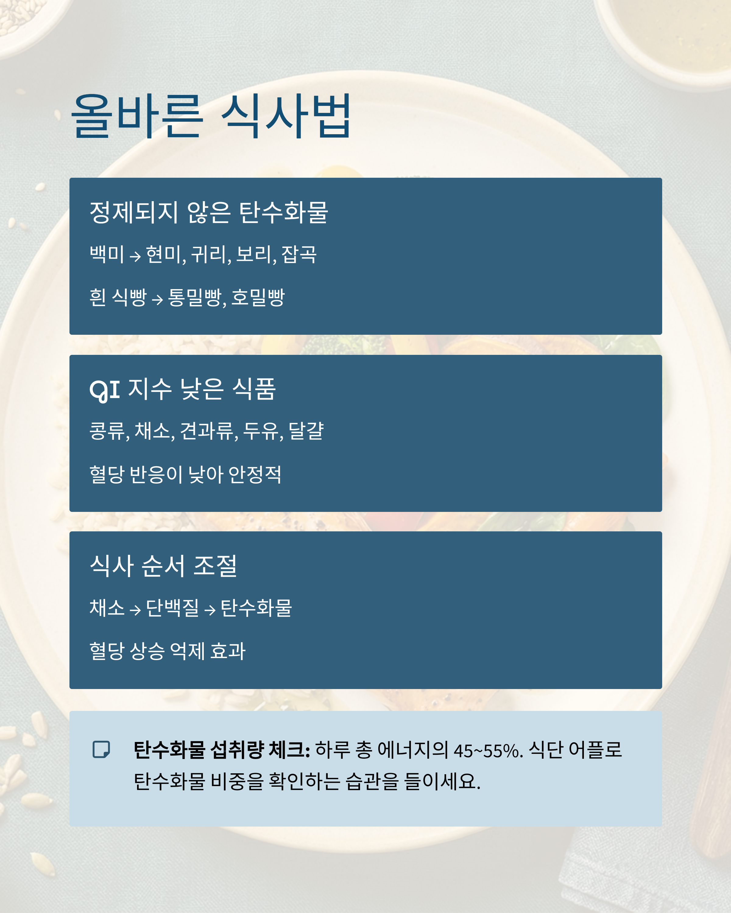 - 채소 → 단백질 → 탄수화물 순으로 섭취하면 혈당 상승 억제 효과