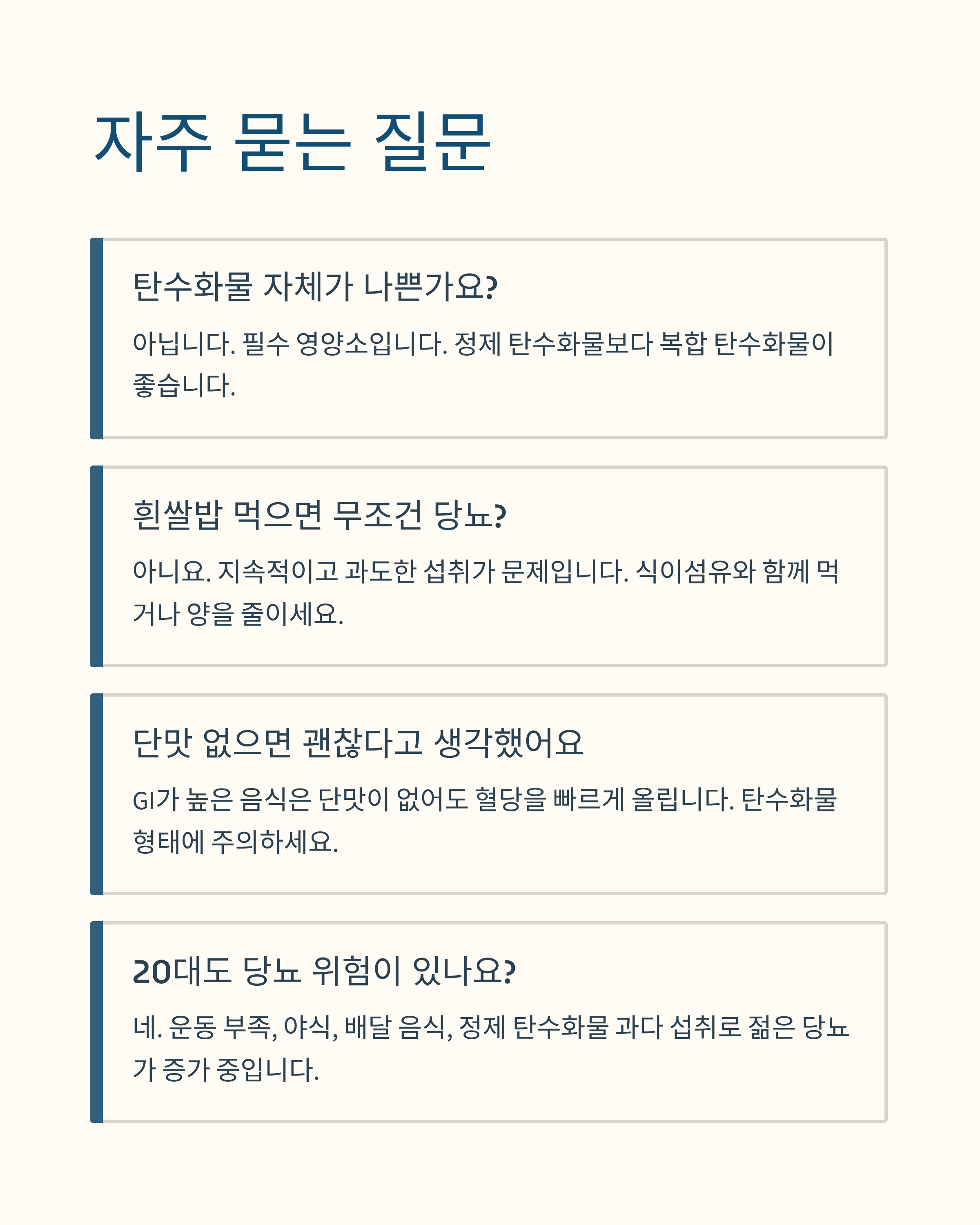 A3. GI(혈당지수)가 높은 음식은 단맛이 없어도 혈당을 빠르게 올릴 수 있습니다. 탄수화물 형태에 주의하세요.