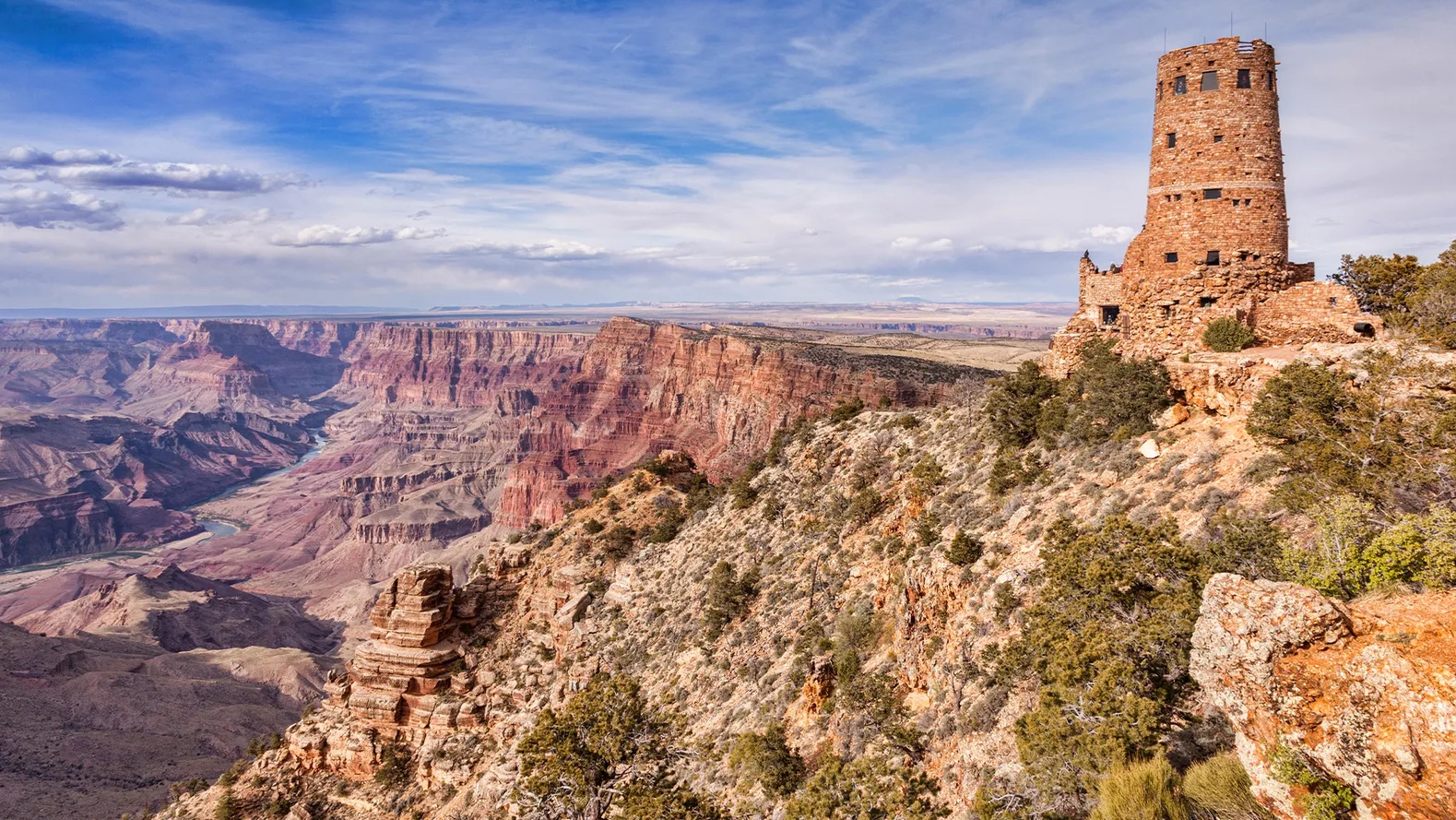그랜드 캐니언의 가장자리에 서 있는 대부분의 사람들은 깜짝 놀라 이 1마일 깊이의 틈을 들여다봅니다.하지만 저는 70피트 높이의 탑이 협곡의 가장자리에 매달려 있는 것을 보기 위해 여기에 있었습니다.1932년에 지어졌고 고대 아메리카 원주민 구조물에서 영감을 받은 사막 전망 망루는 메리 콜터 (1869년-1958년)의 작품입니다.그녀 시대의 몇 안 되는 여성 건축가 중 한 명인 Colter는 미국 남서부의 아메리카 원주민과 스페인 유산에 뿌리를 둔 건물을 선호하여 유럽 디자인을 거부했습니다.