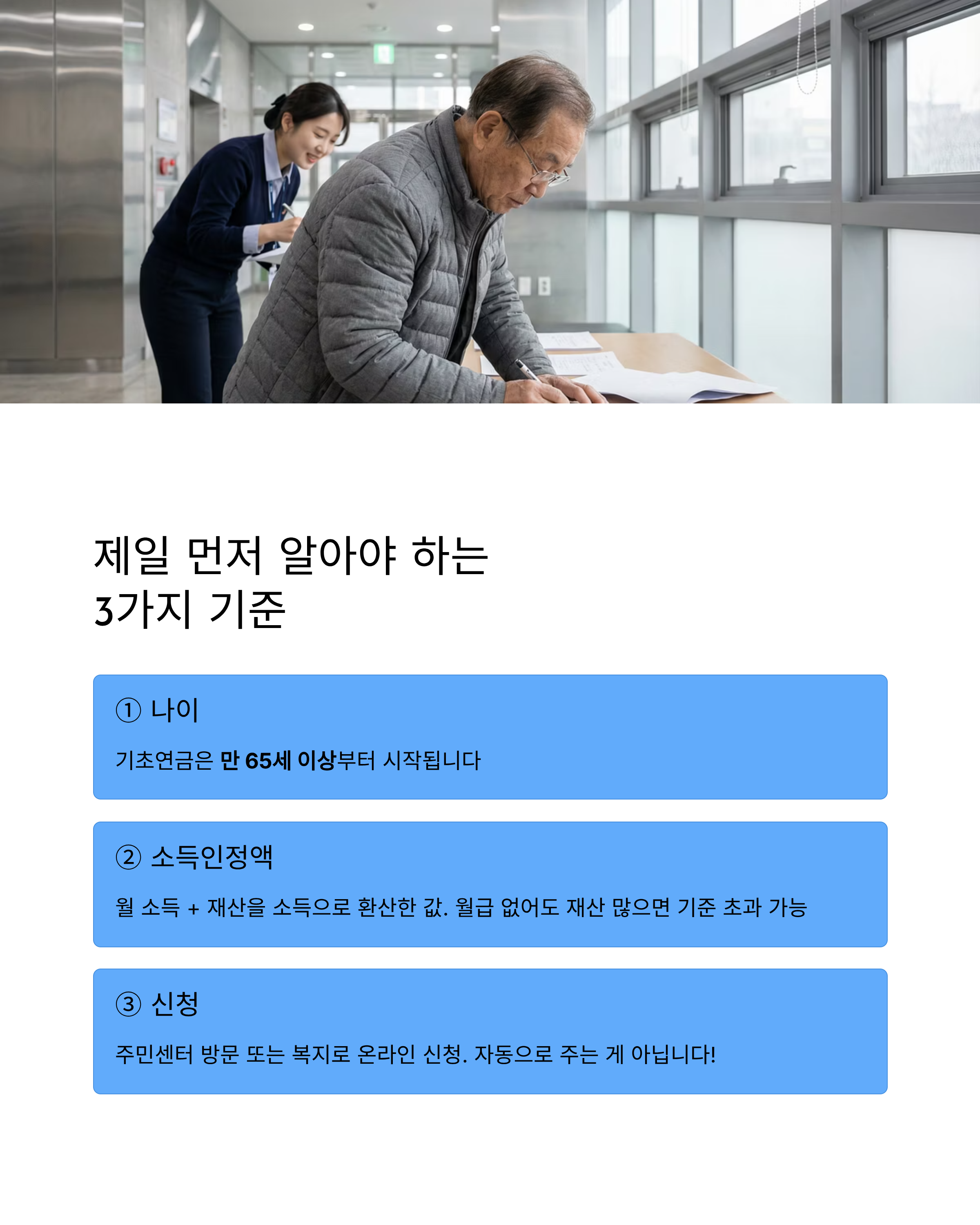 - 만 65세 이상 + 소득인정액이 선정기준액 이하인 경우(대략 ‘하위 70%’ 수준을 목표로 기준이 정해짐)