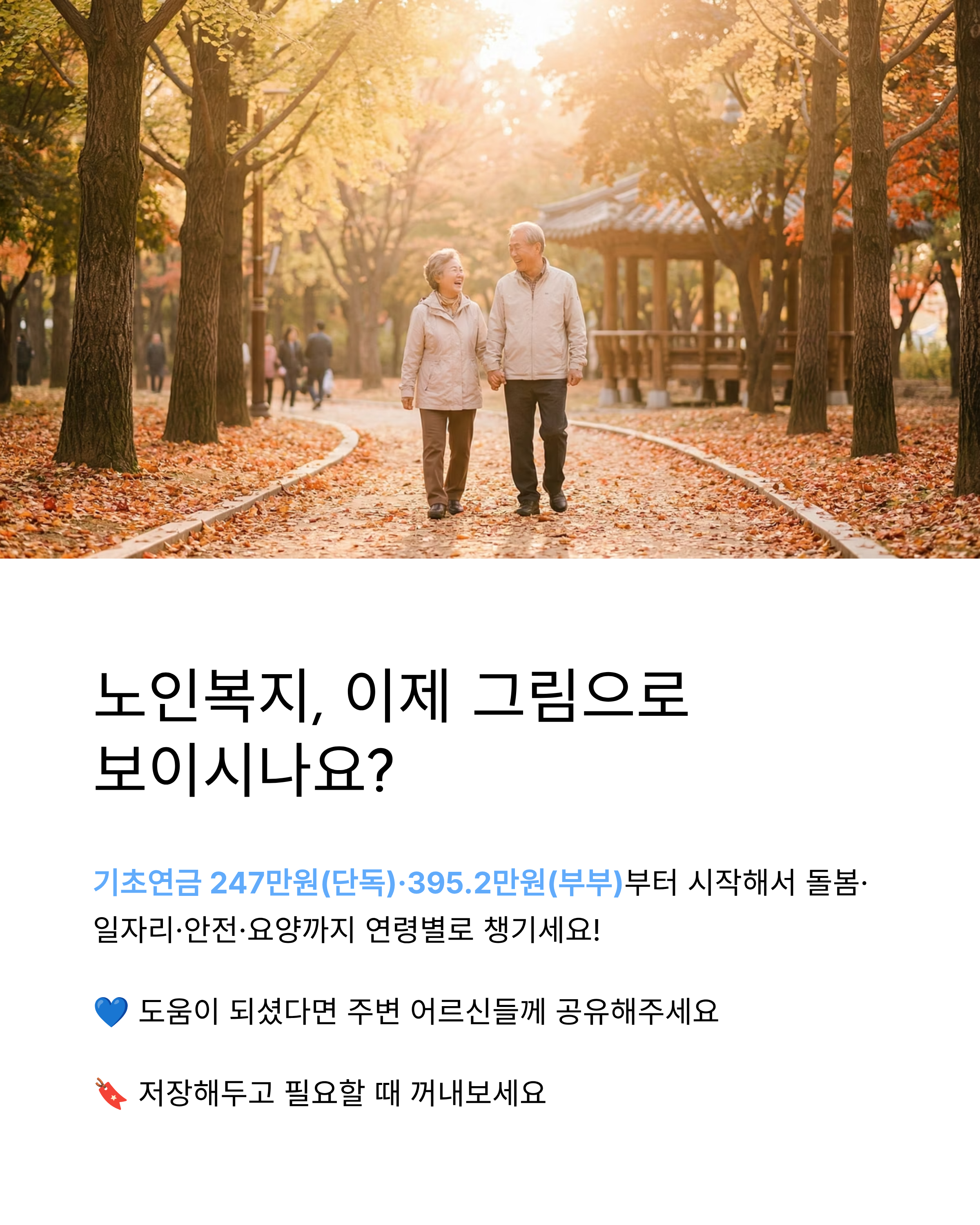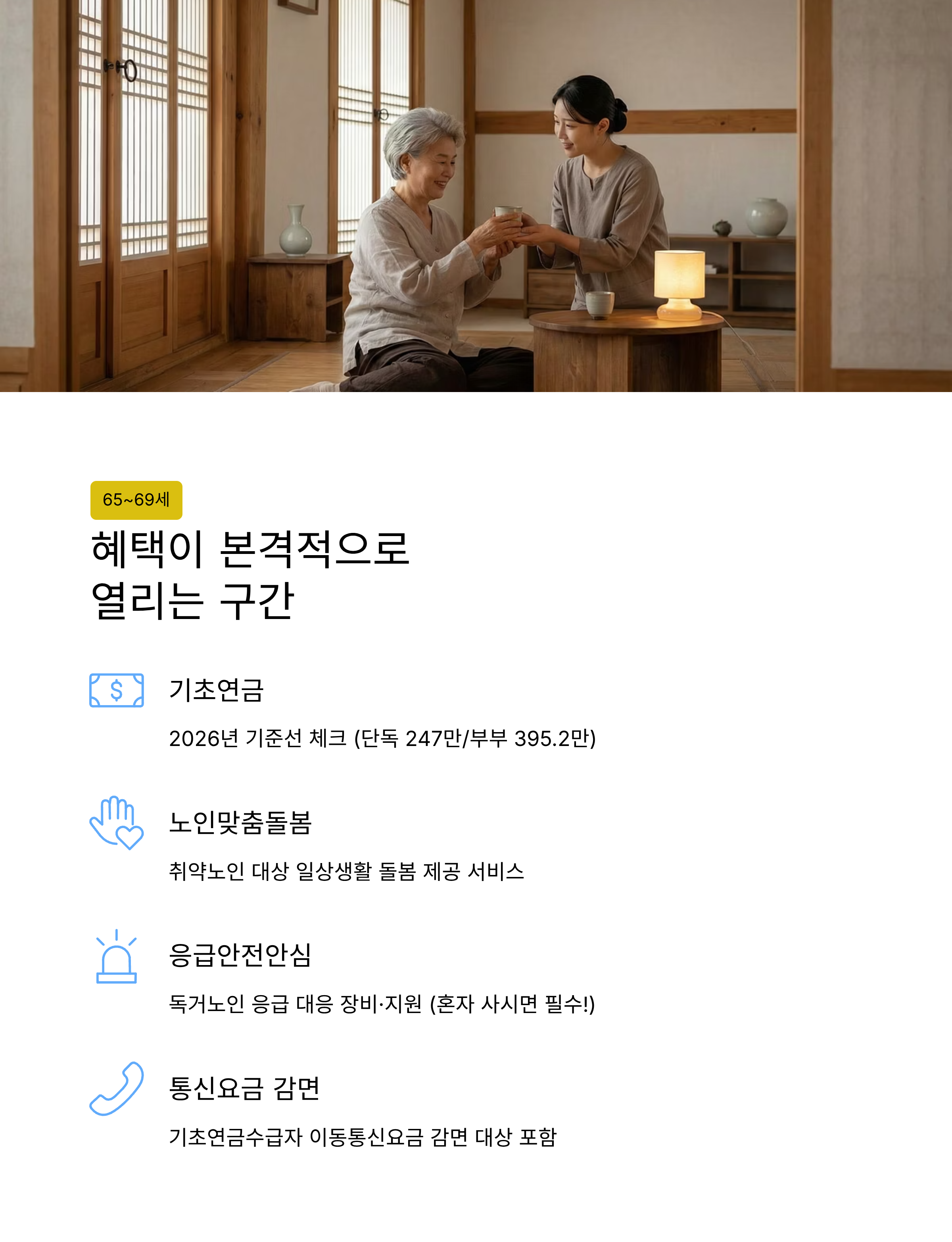 메타 설명: 2026년 기초연금(단독 247만·부부 395.2만 선정기준액)부터 노인맞춤돌봄, 노인일자리, 응급안전안심서비스, 장기요양(재가·시설)까지 연령대별로 무엇을 먼저 챙기면 좋은지 쉽게 정리한 노인복지 가이드입니다.