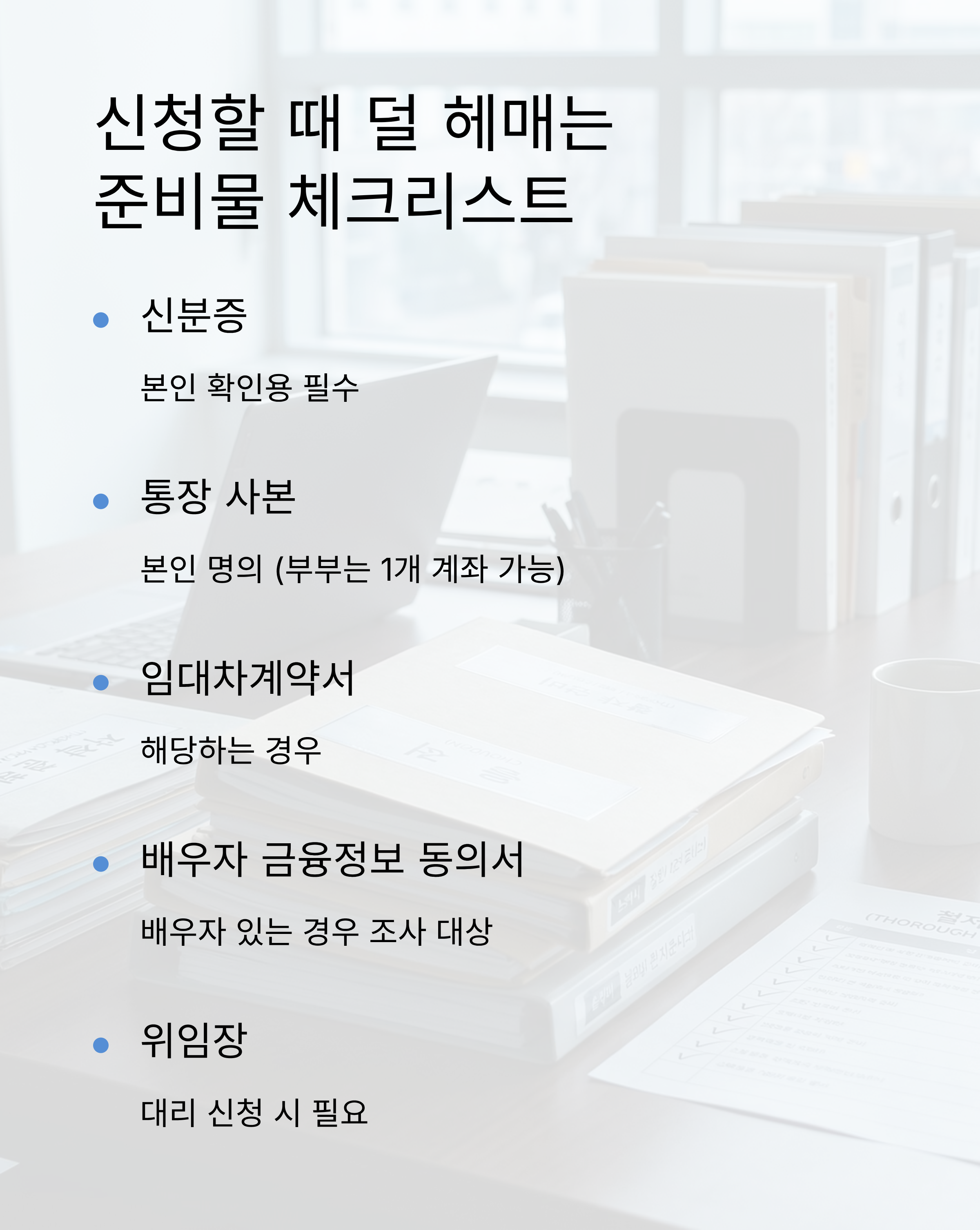 - □ 본인 명의 통장 사본(부부는 1개 계좌로도 가능한 경우가 안내됨)