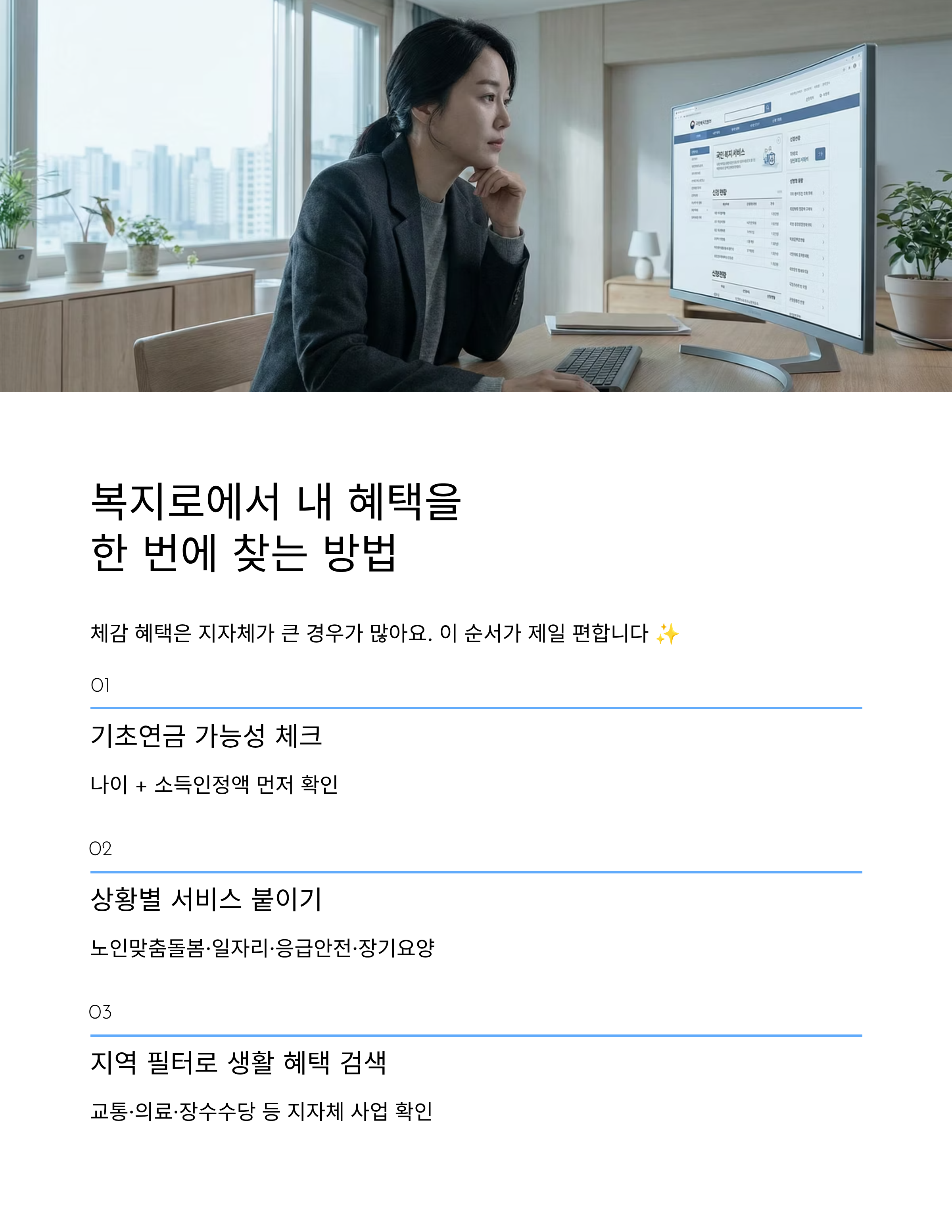 노인복지는 ‘전국 공통(중앙)’도 있지만, 체감 혜택은 ‘지자체’가 큰 경우가 많아요. 그래서 아래 순서가 제일 편합니다.