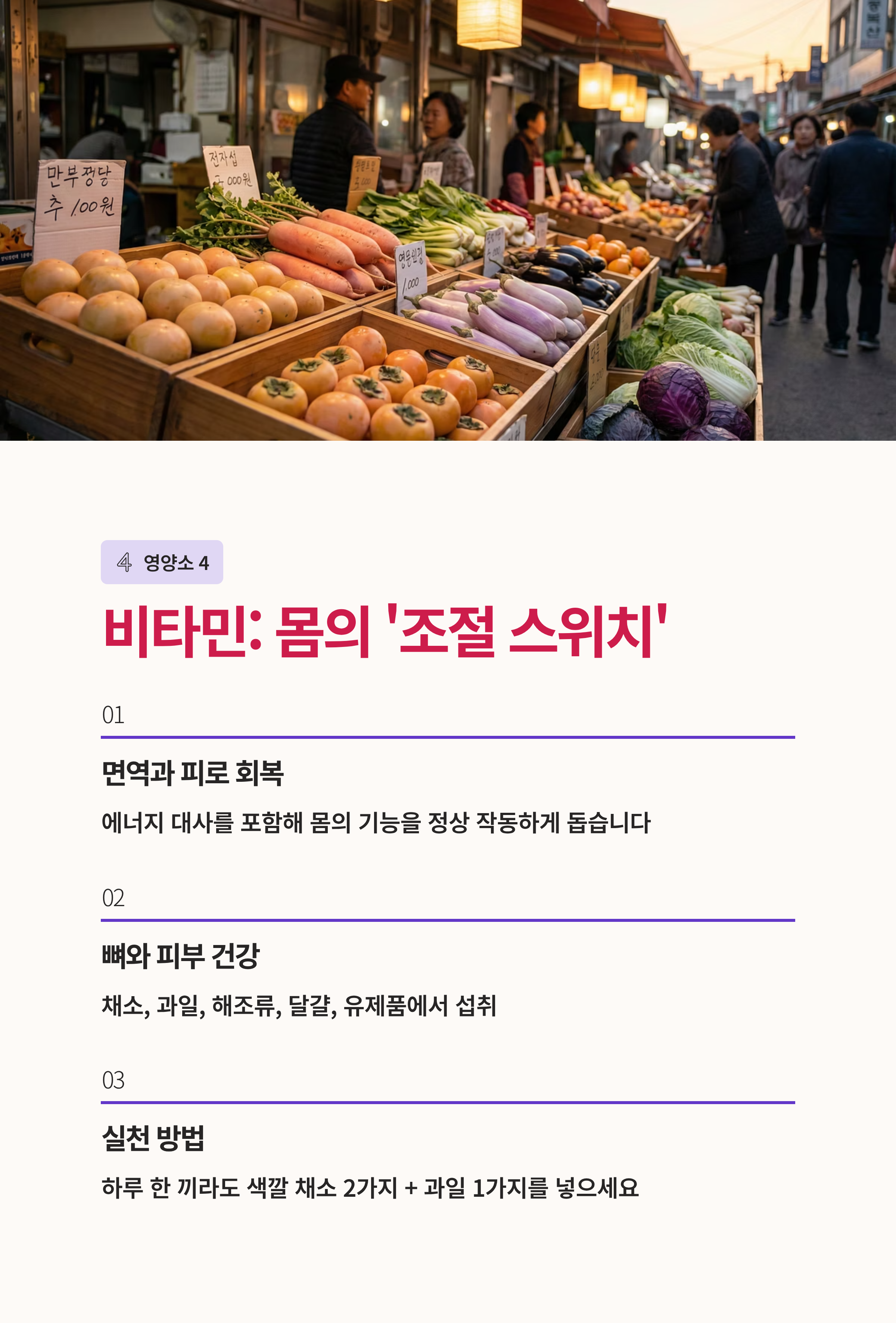 - 실천 팁: 하루 한 끼라도 “색깔 채소 2가지 + 과일 1가지”를 넣으면 비타민이 확 좋아집니다.