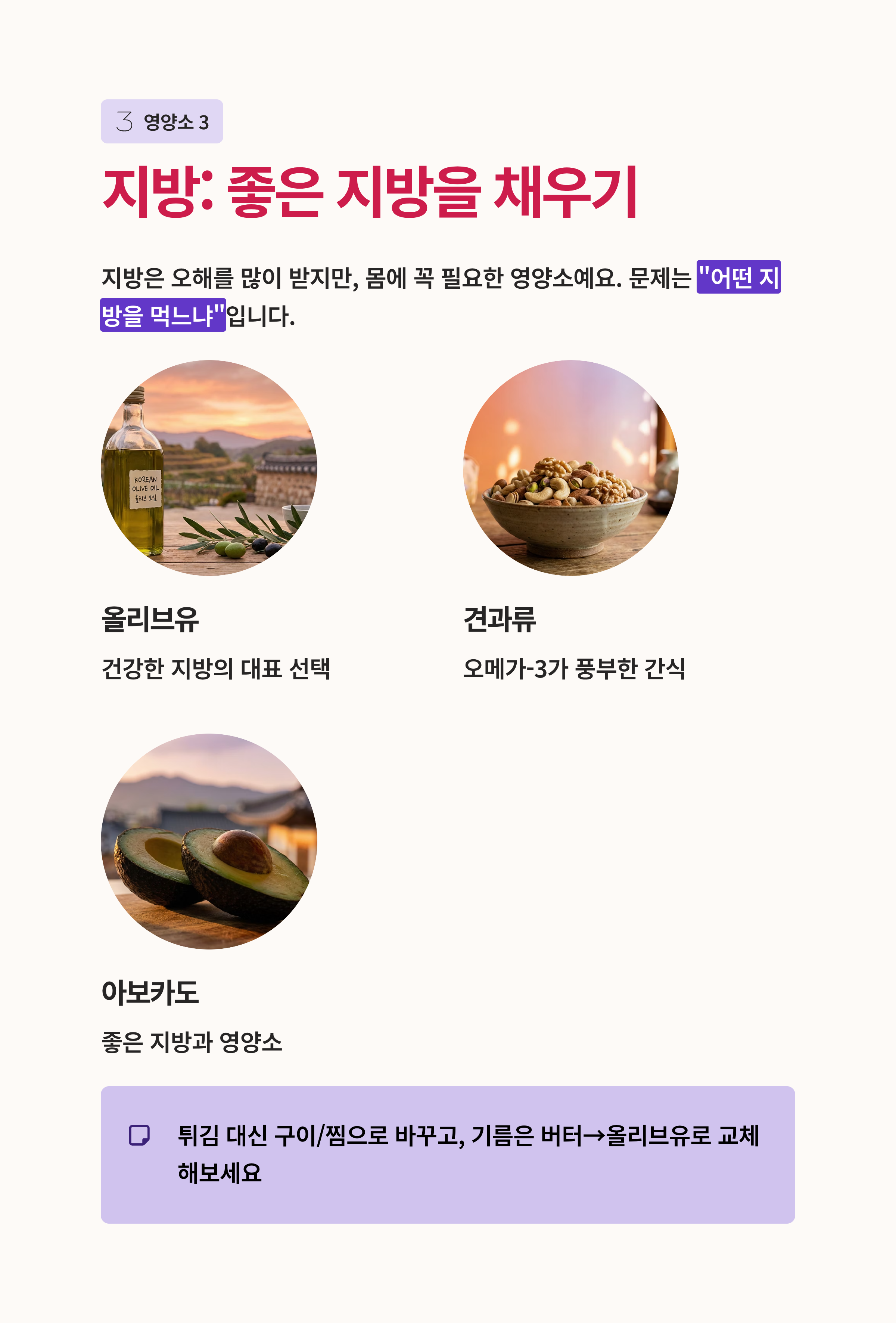 3) 지방: 무조건 줄일 게 아니라 ‘좋은 지방’을 채우기