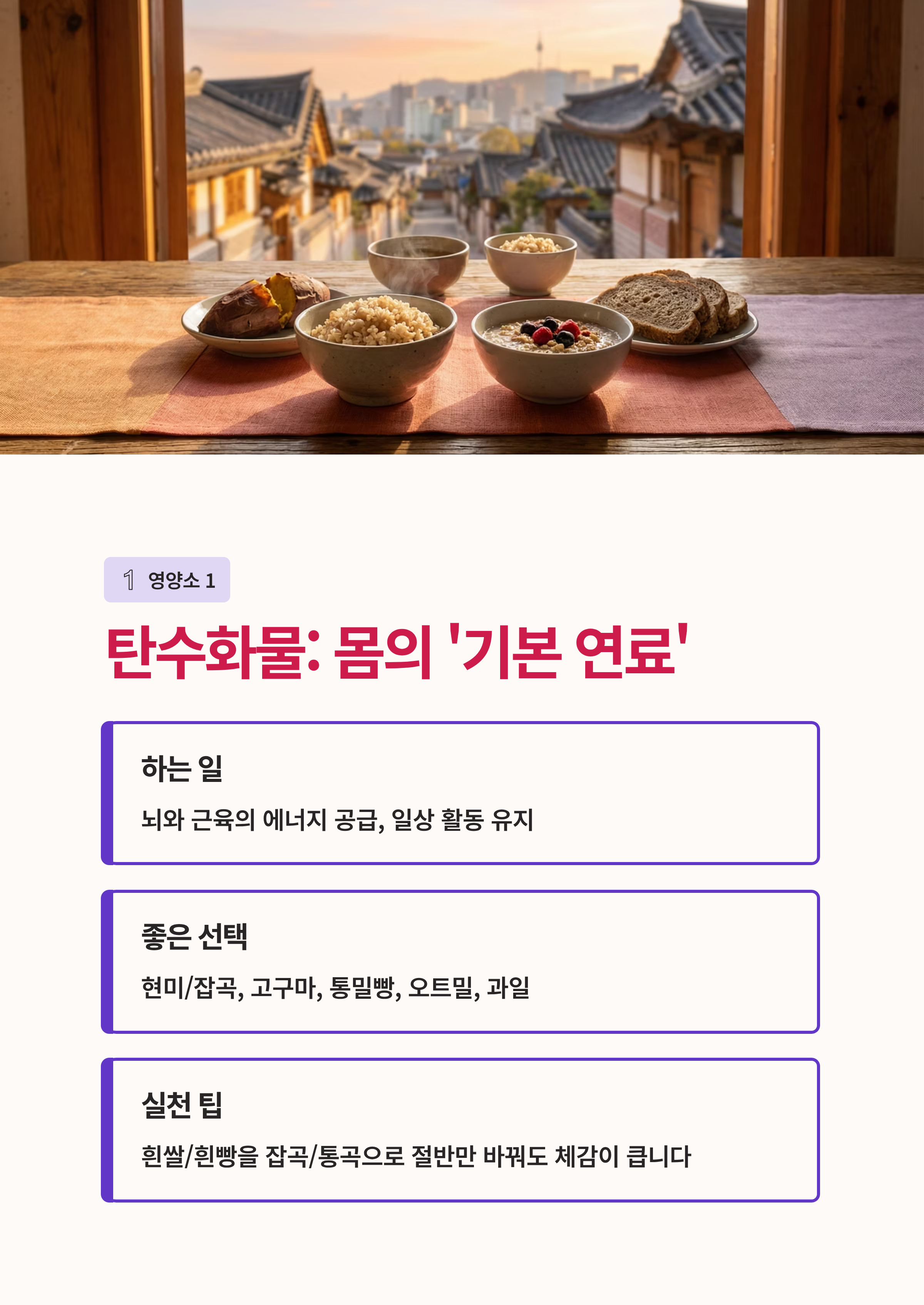 탄수화물은 우리 몸이 가장 빠르게 쓰는 에너지예요. 완전히 끊기보다는 종류를 바꾸는 것이 포인트입니다.