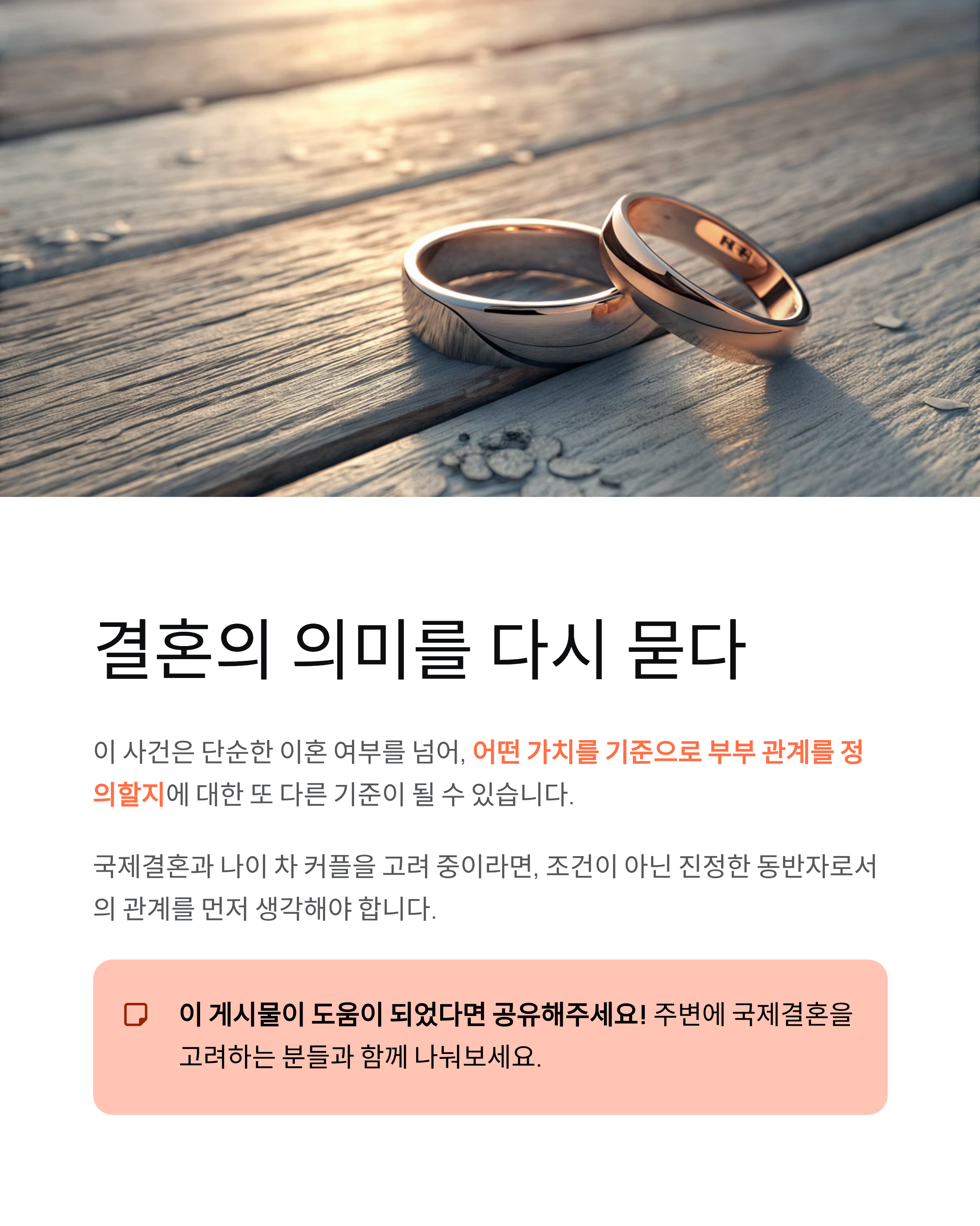 이 사건은 ‘사랑’이라는 단어보다 ‘계산’이 앞선 결정으로 받아들여집니다. 부부라는 관계가 서로의 변화까지도 함께 감당하는 것이지만, 일방의 조건 중심 판단은 결국 관계를 파괴로 이끕니다.