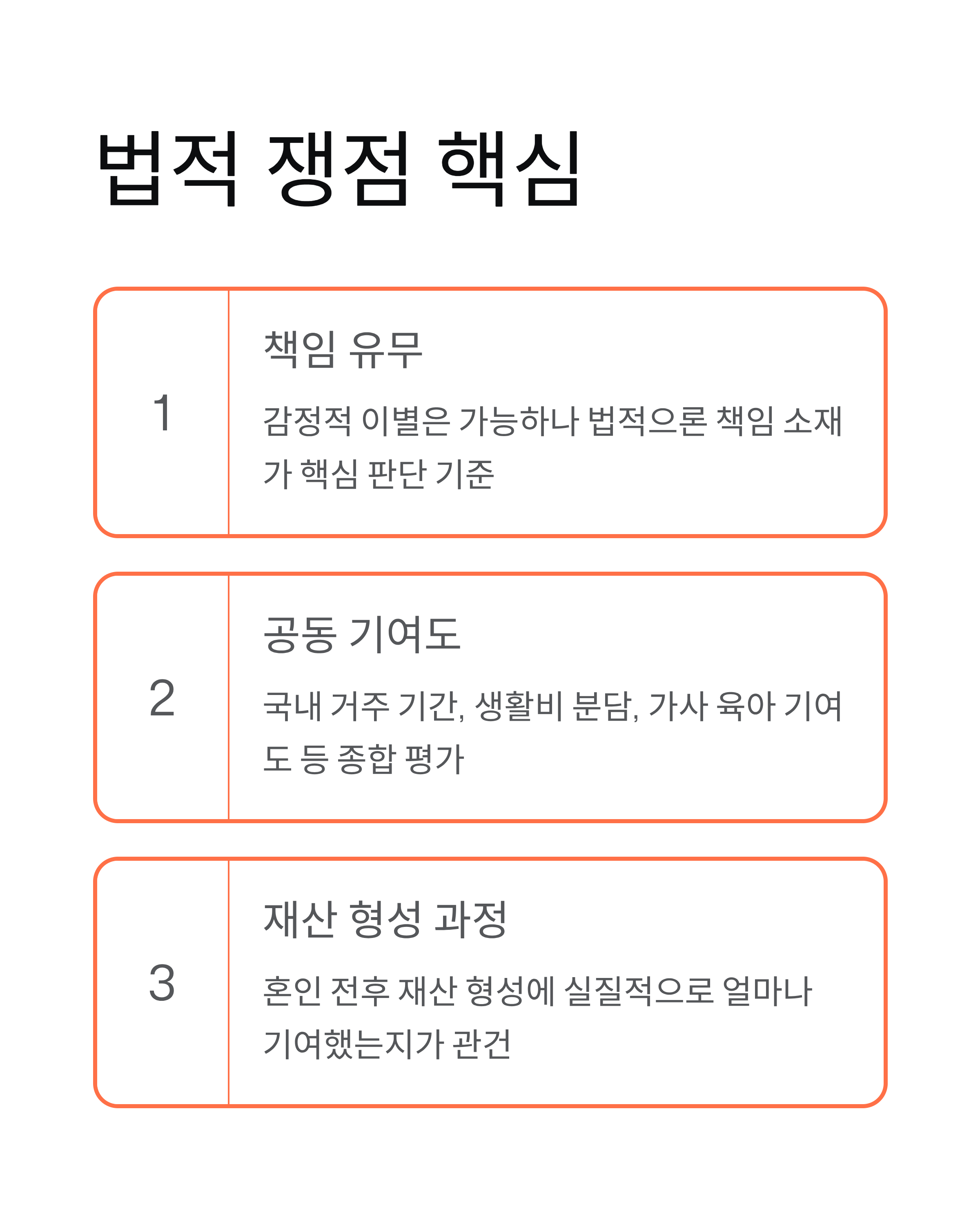 즉, 감정적으로는 갈라설 수 있어도 법적으로는 ‘책임 유무’가 핵심 쟁점이 된다는 이야기입니다.