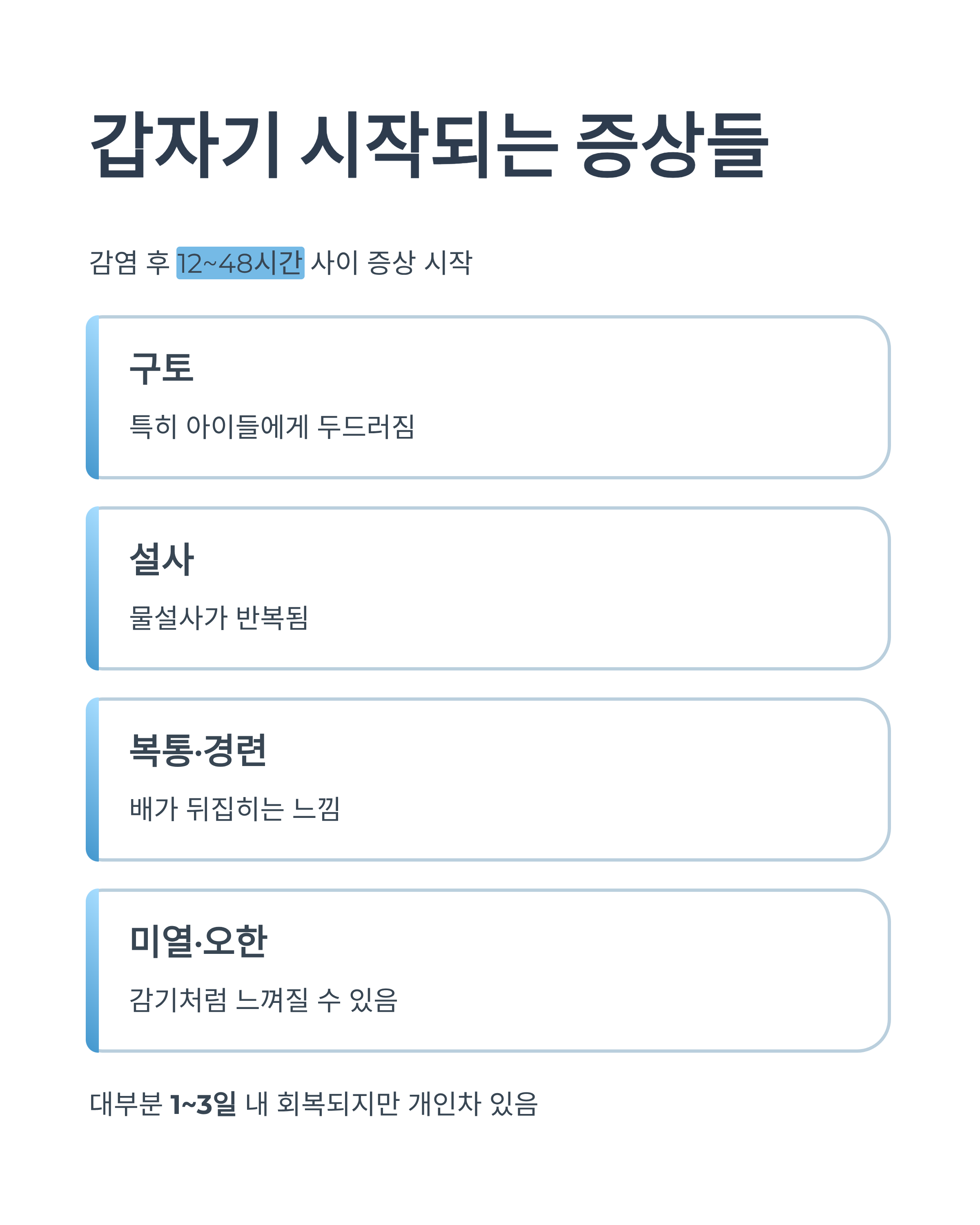 대부분 1~3일 내에 좋아지지만, 컨디션·연령·기저질환에 따라 더 길어질 수 있어요.