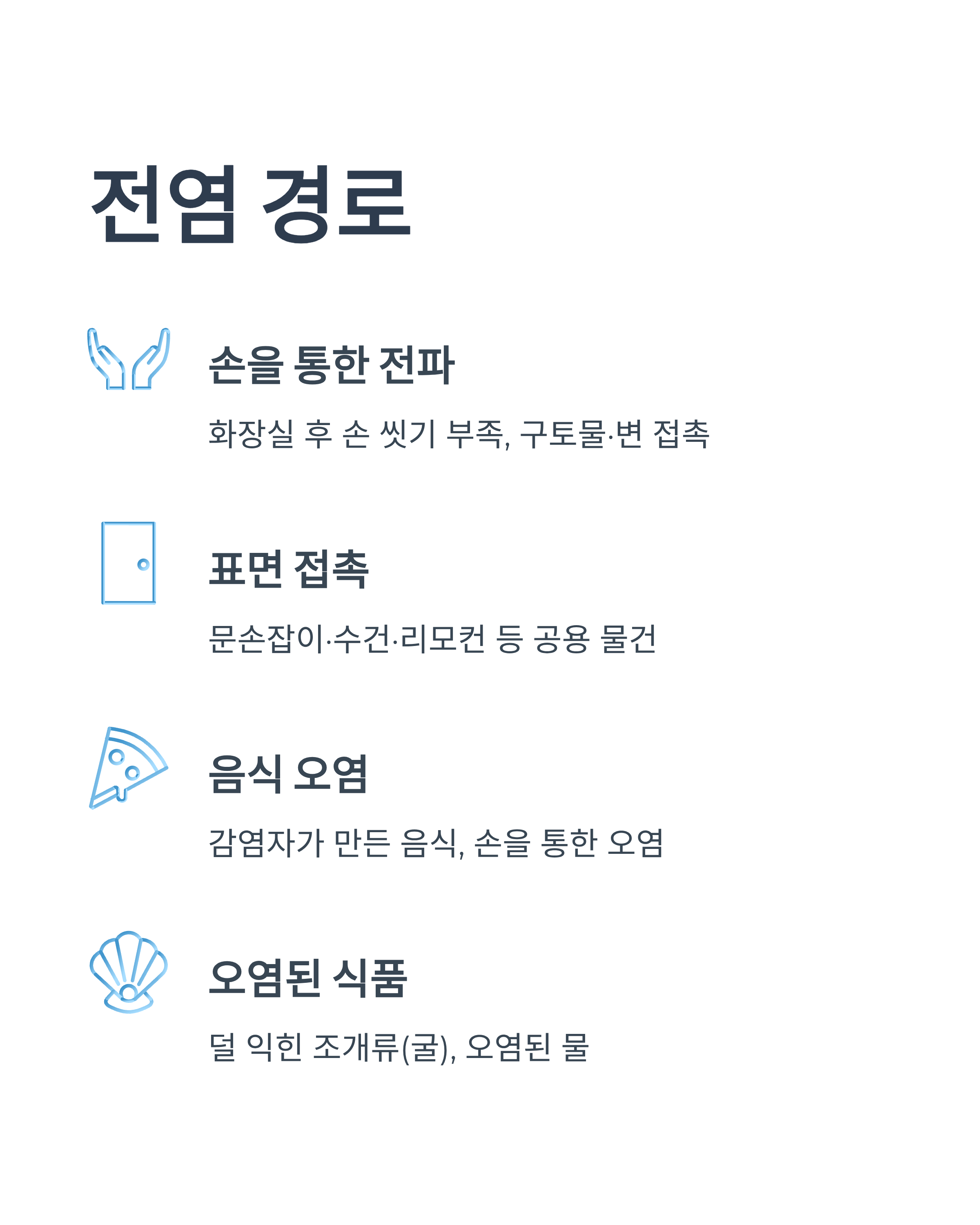 - 손·표면·음식·물을 통해 쉽게 옮음