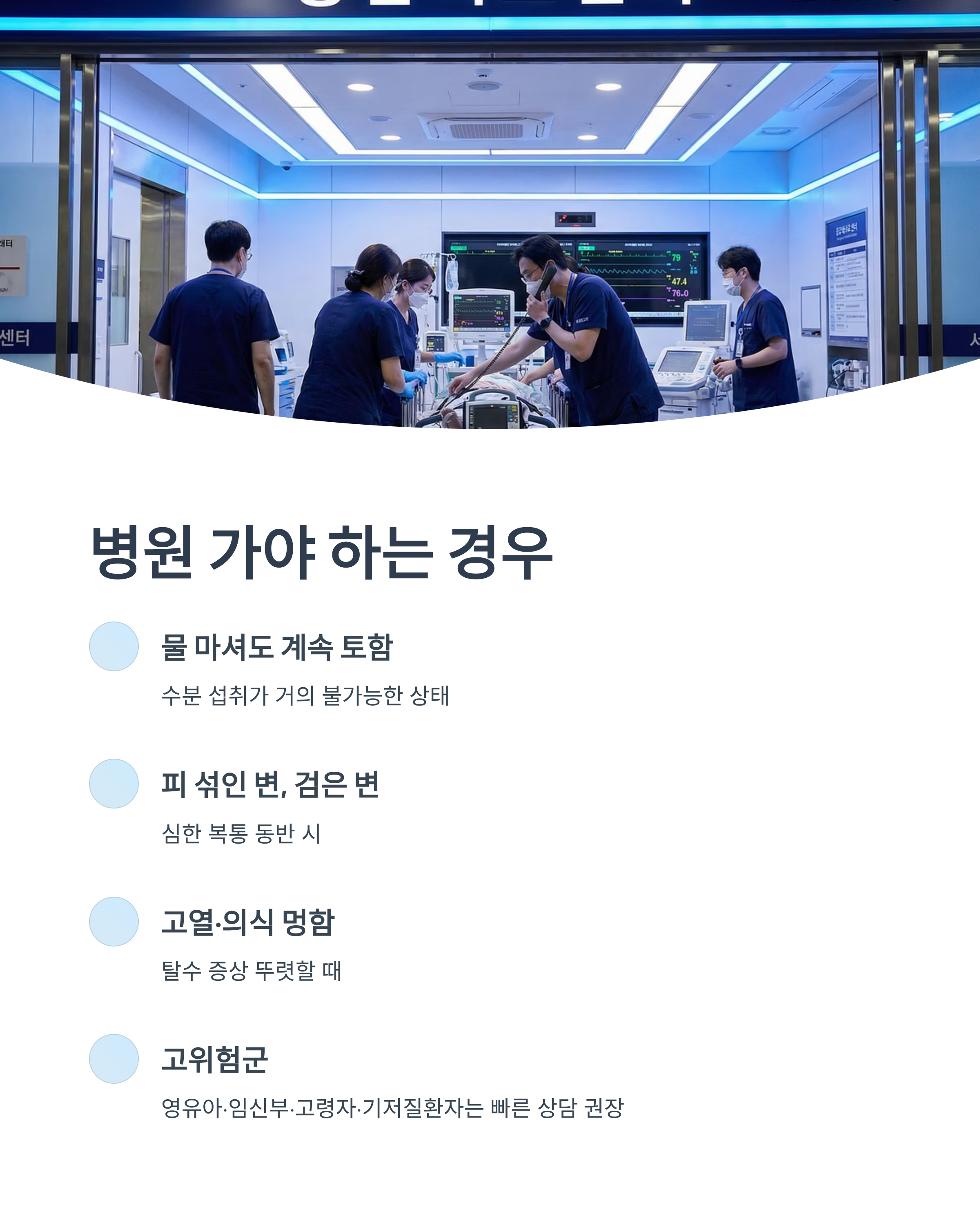 - 탈수 증상이 뚜렷(소변 거의 없음, 심한 어지러움)