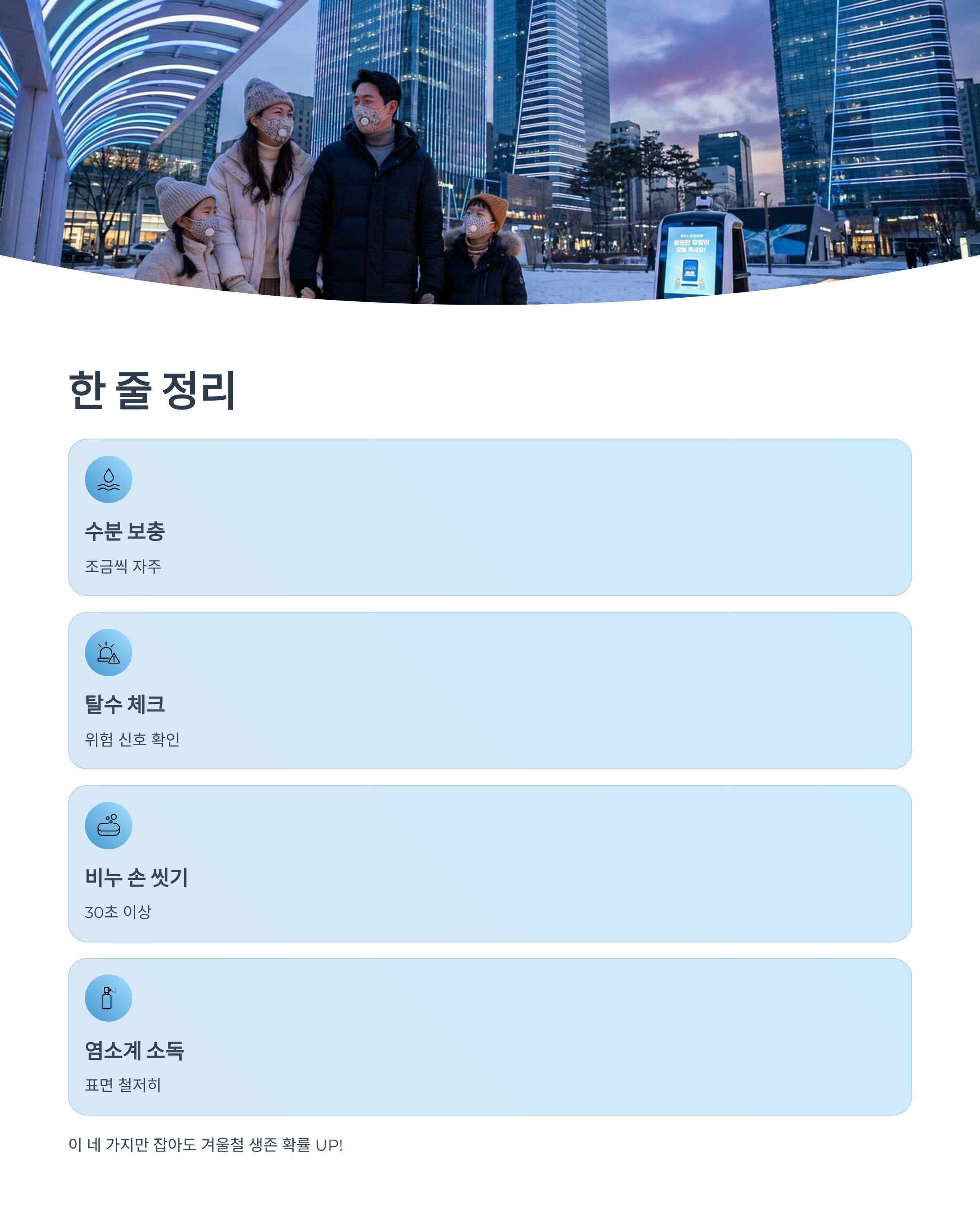 수분 보충 + 탈수 체크 + 비누 손 씻기 + 염소계 소독 이 네 가지만 잡아도 겨울철 생존 확률이 확 올라갑니다.