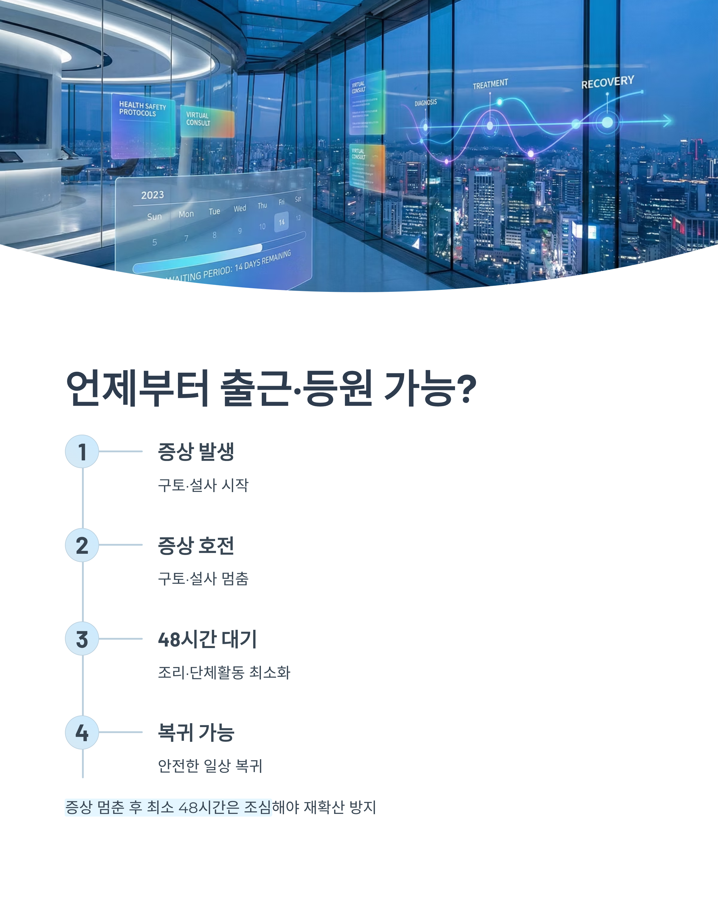 증상이 좋아졌다고 바로 활동하면 재확산이 생기기 쉬워요.