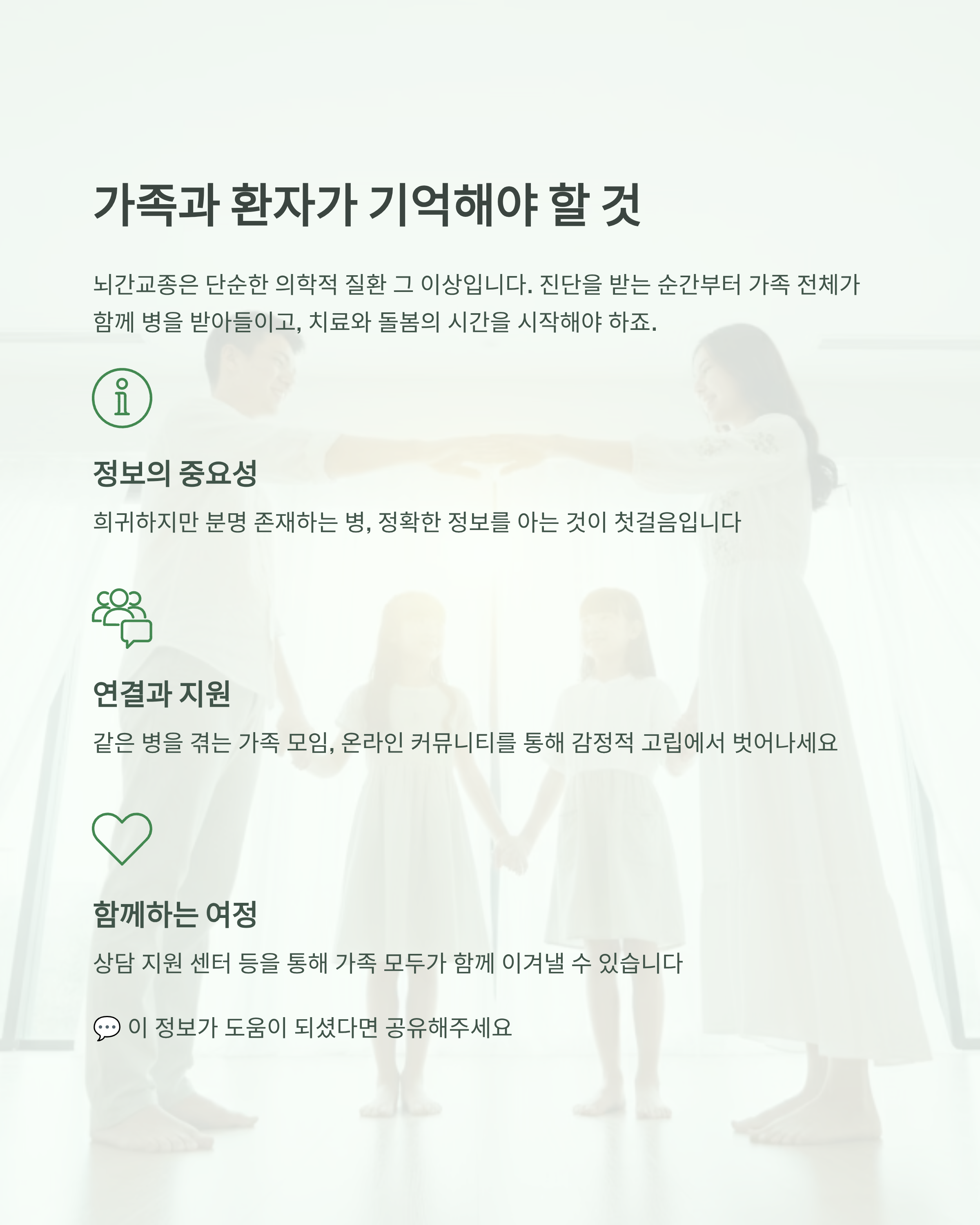 뇌간교종은 단순한 의학적 질환 그 이상입니다. 진단을 받는 순간부터 가족 전체가 함께 병을 받아들이고, 치료와 돌봄의 시간을 시작해야 하죠.