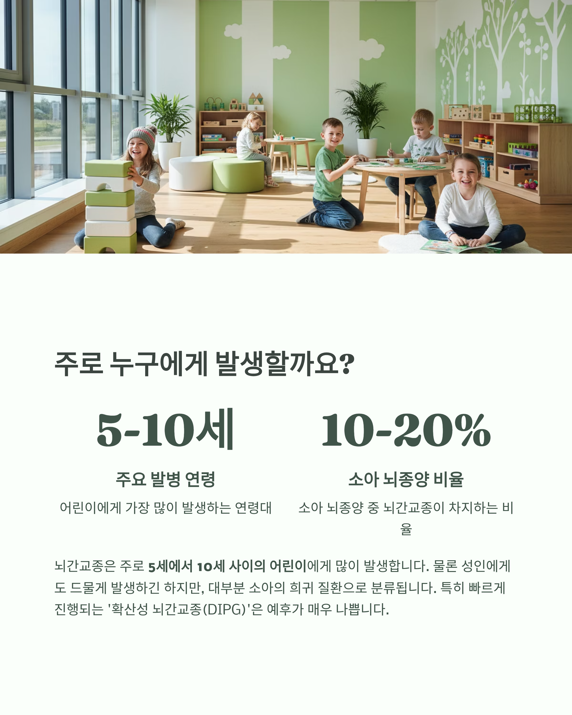 뇌간교종은 주로 5세에서 10세 사이의 어린이에게 많이 발생합니다. 물론 성인에게도 드물게 발생하긴 하지만, 대부분 소아의 희귀 질환으로 분류됩니다.