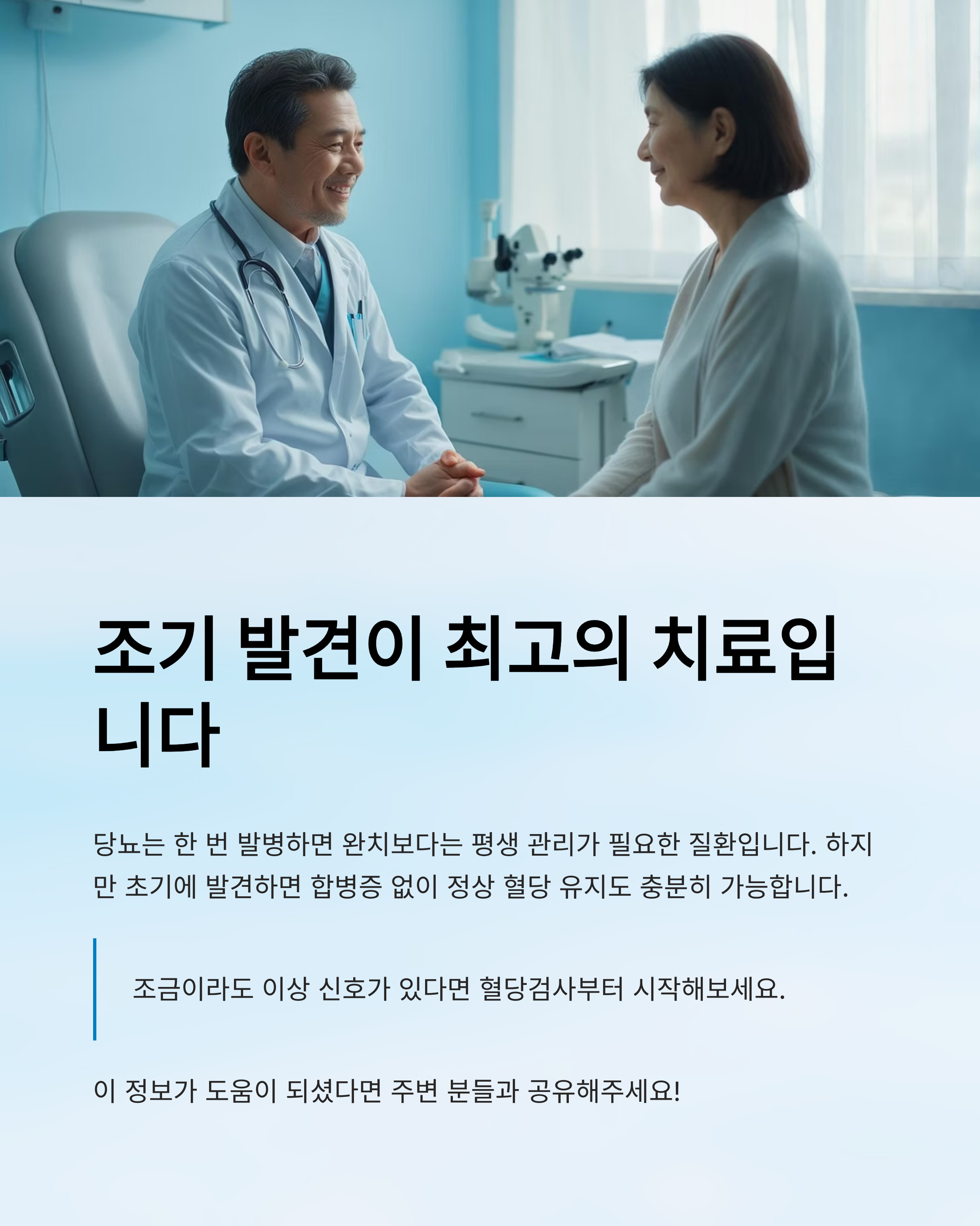 방치할 경우 신장병, 실명, 심혈관 질환 등 다양한 합병증으로 이어질 수 있습니다.