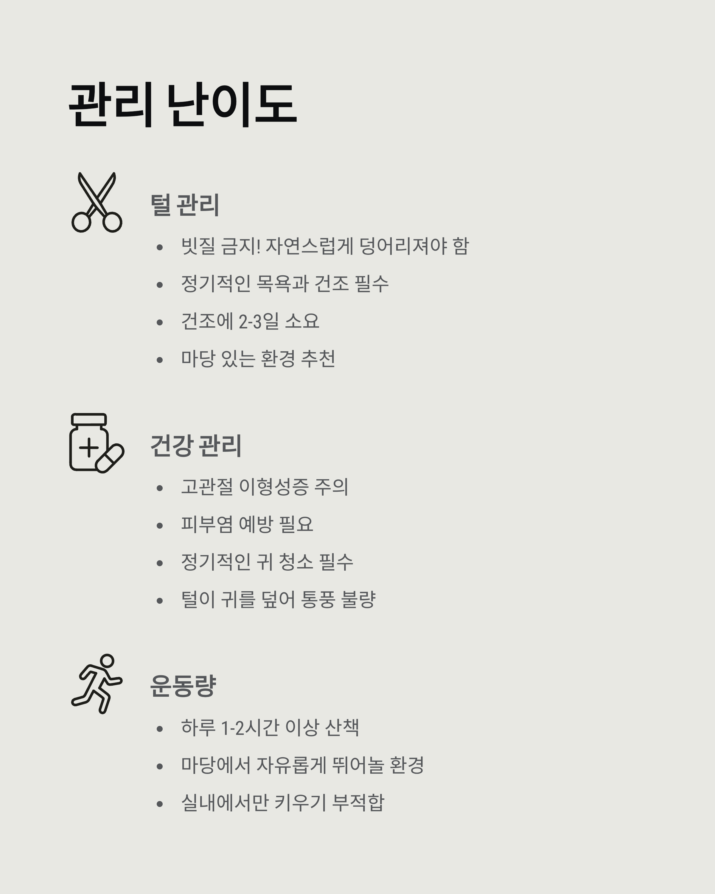 관리 난이도 (털, 건강, 운동량 등)