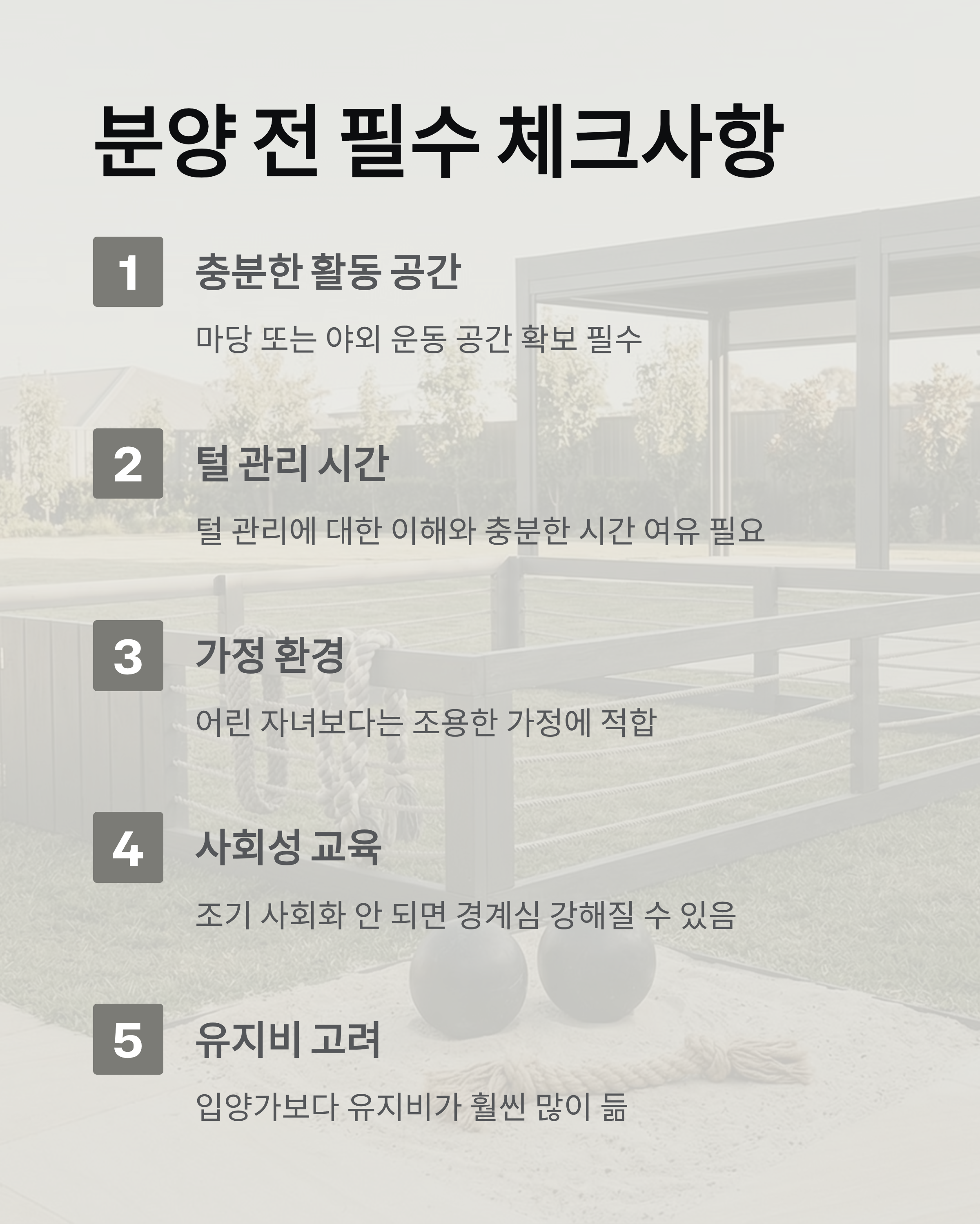 - 마당에서 자유롭게 뛰어놀 수 있는 환경 선호