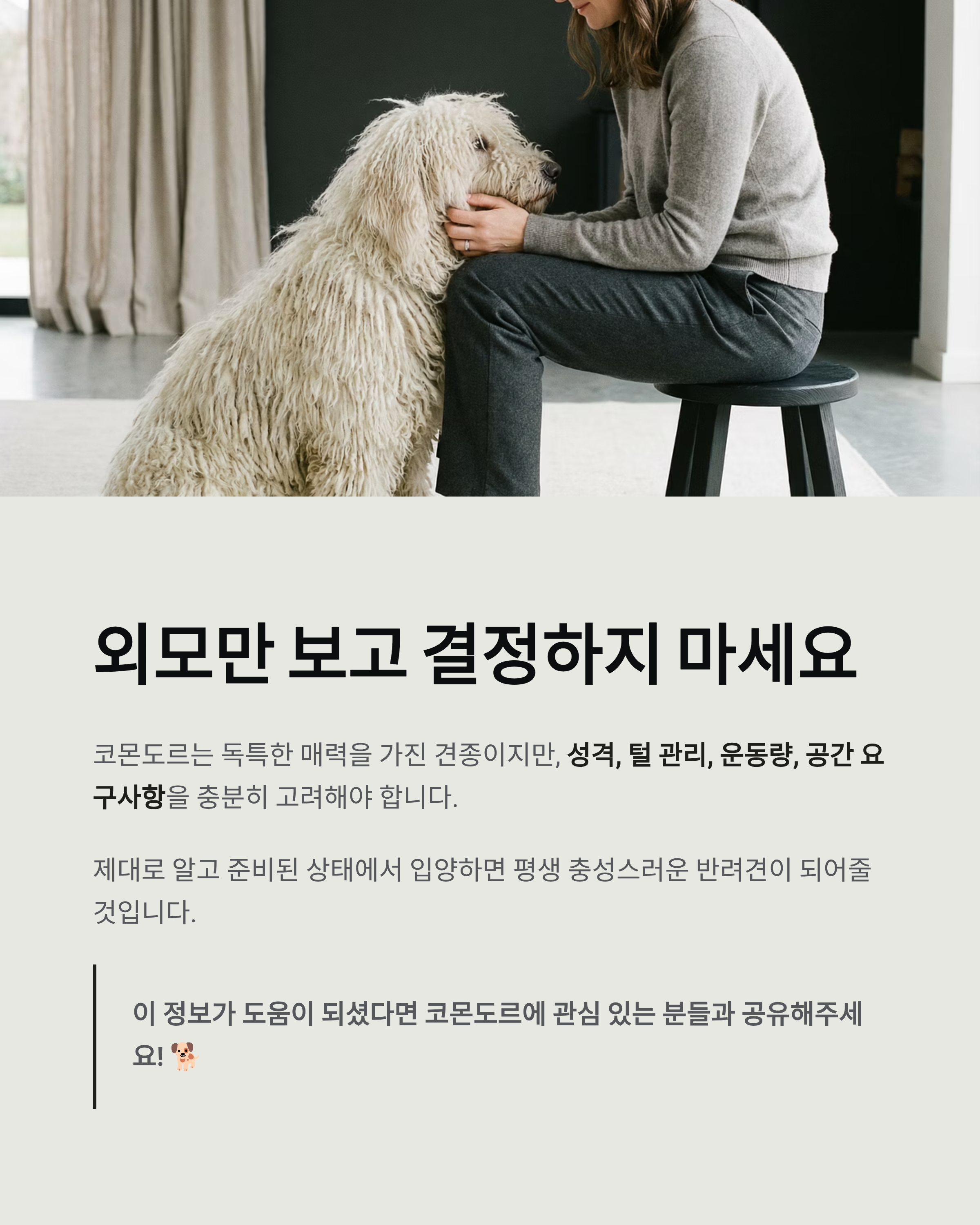 이 글에서는 코몬도르의 특징, 성격, 분양 전 유의사항, 다른 견종과의 차이점, 초보자 적합 여부까지 정리해본다.
