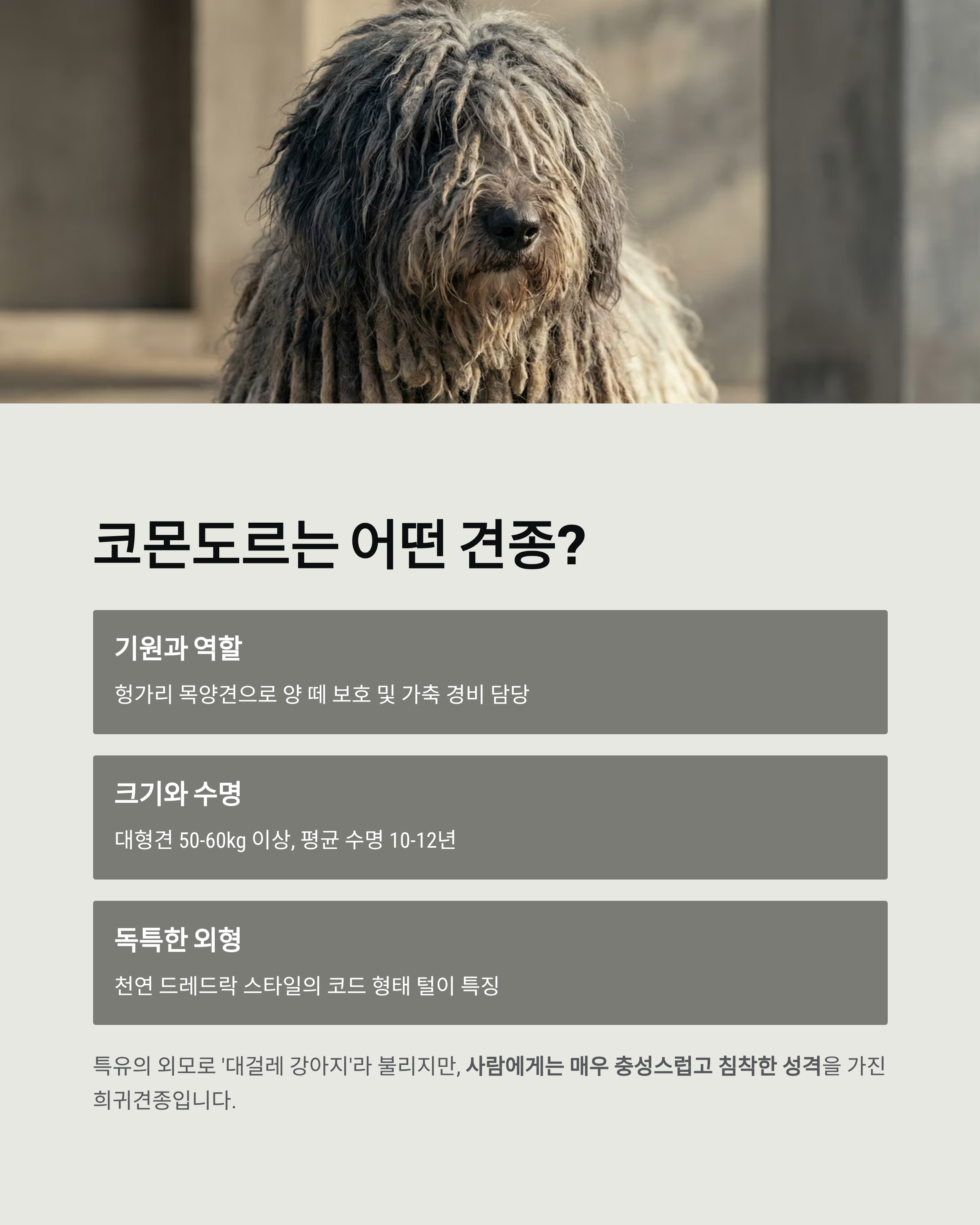 - 외형 특징: 천연 드레드락 스타일의 털이 뭉쳐진 코드(Coat) 형태