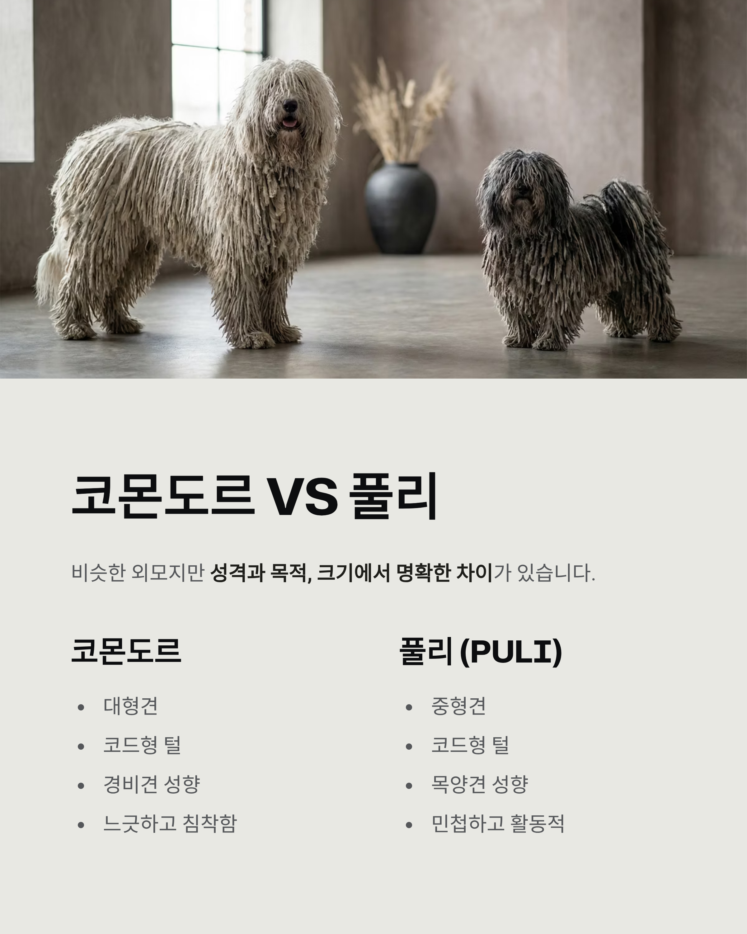 - 코몬도르: 대형견 / 코드형 털 / 경비견 성향 / 느긋하고 침착