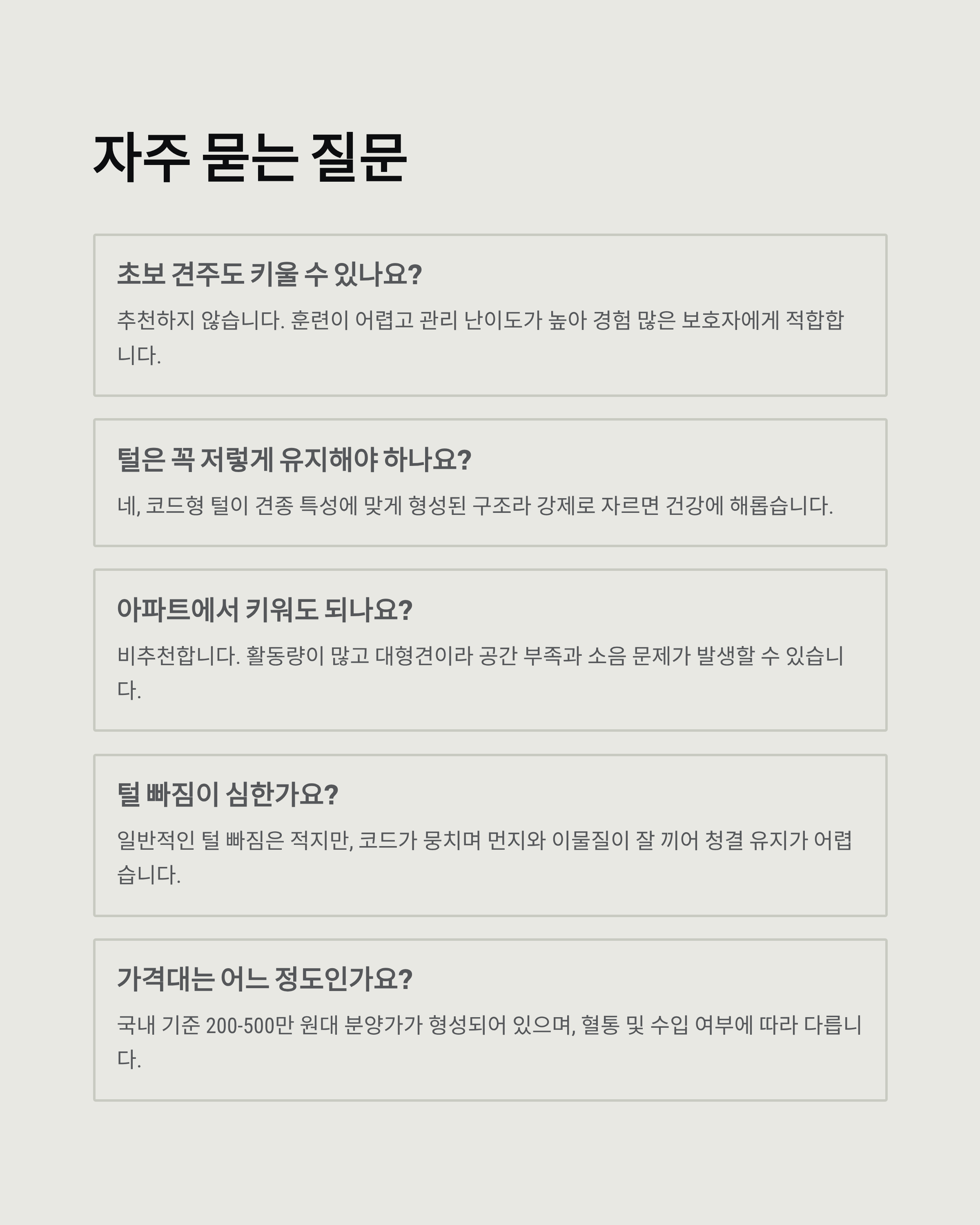 A2. 네, 코드형 털이 이 견종의 건강과 특성에 맞게 형성된 구조라 강제로 자르거나 빗으면 오히려 건강에 해롭습니다.