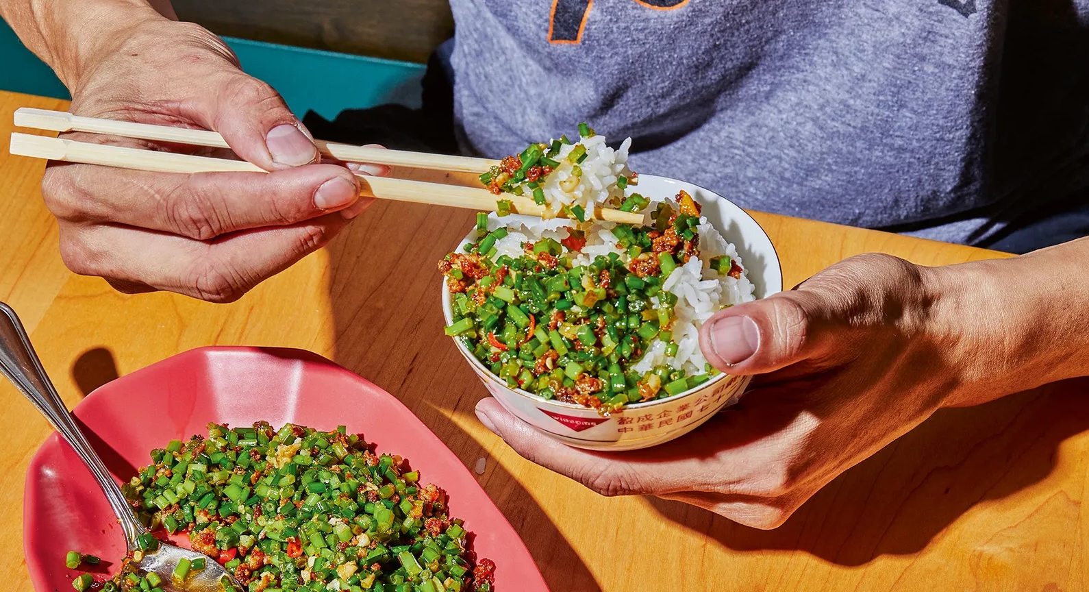 이 음식은 보통 밥보다 더 맛있게 먹지만, 브라운은 레스토랑이 문을 열기 전 초기에 쿠와 그의 친구들과 함께 한 저녁 파티에서 그 조언을 조금 지나치게 열렬히 받아들인 적이 있다고 인정합니다."저는 그것을 점토 냄비에 밥 위에 올려놓았는데, 이것은 일종의 파격적인 것입니다.귀엽다고 생각했어요.하지만 윗도리를 벗었을 때, 부추가 찌었기 때문에 모든 쪽파가 회색으로 변했습니다," 라고 브라운이 말했습니다."그는 '당신이 더 이상 내 파트너가 되고 싶지 않다면 나는 이해할 것이다'와 같았어요,"라고 구씨는 웃으며 덧붙였습니다.