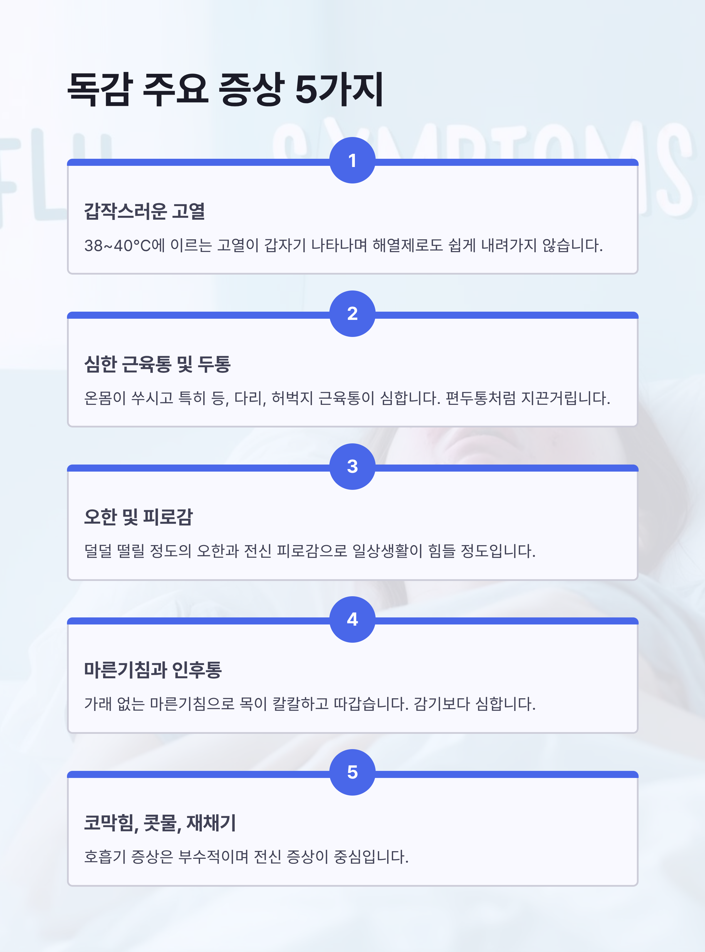 독감 증상은 감기와 명확히 구분되는 특징이 있습니다. 고열, 근육통, 오한 등 독감의 주요 증상과 감별법, 대처법, 예방 방법까지 한 번에 확인하세요.