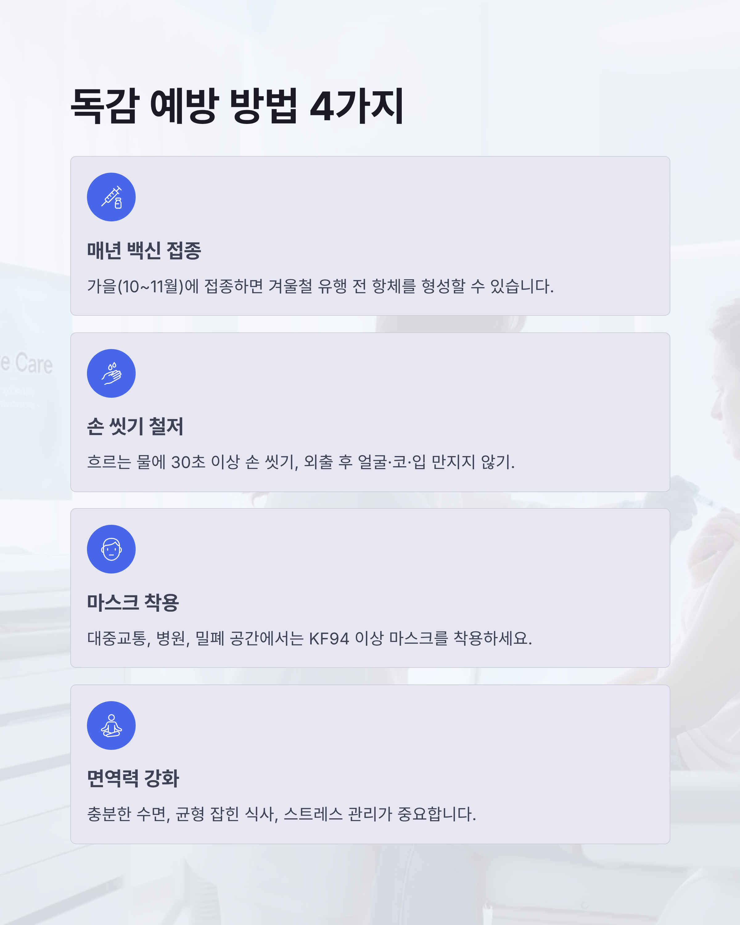 가을(10~11월)에 접종하면 겨울철 유행 전 항체를 형성할 수 있습니다. - 손 씻기 및 개인위생 철저