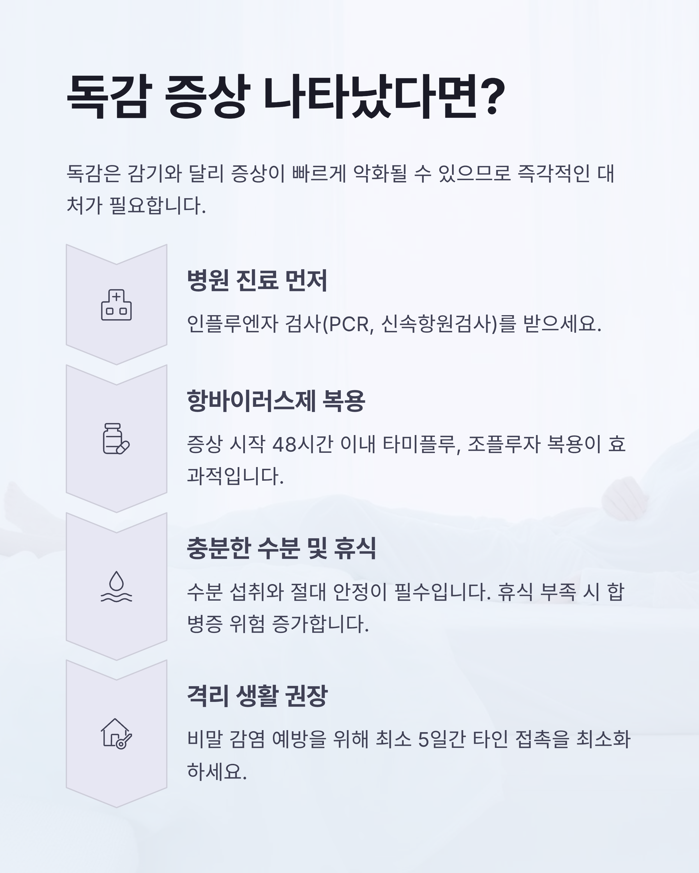 독감은 감기와 달리, 증상이 빠르게 악화될 수 있으므로 **병원에서 인플루엔자 검사(PCR, 신속항원검사)**를 받는 것이 우선입니다.