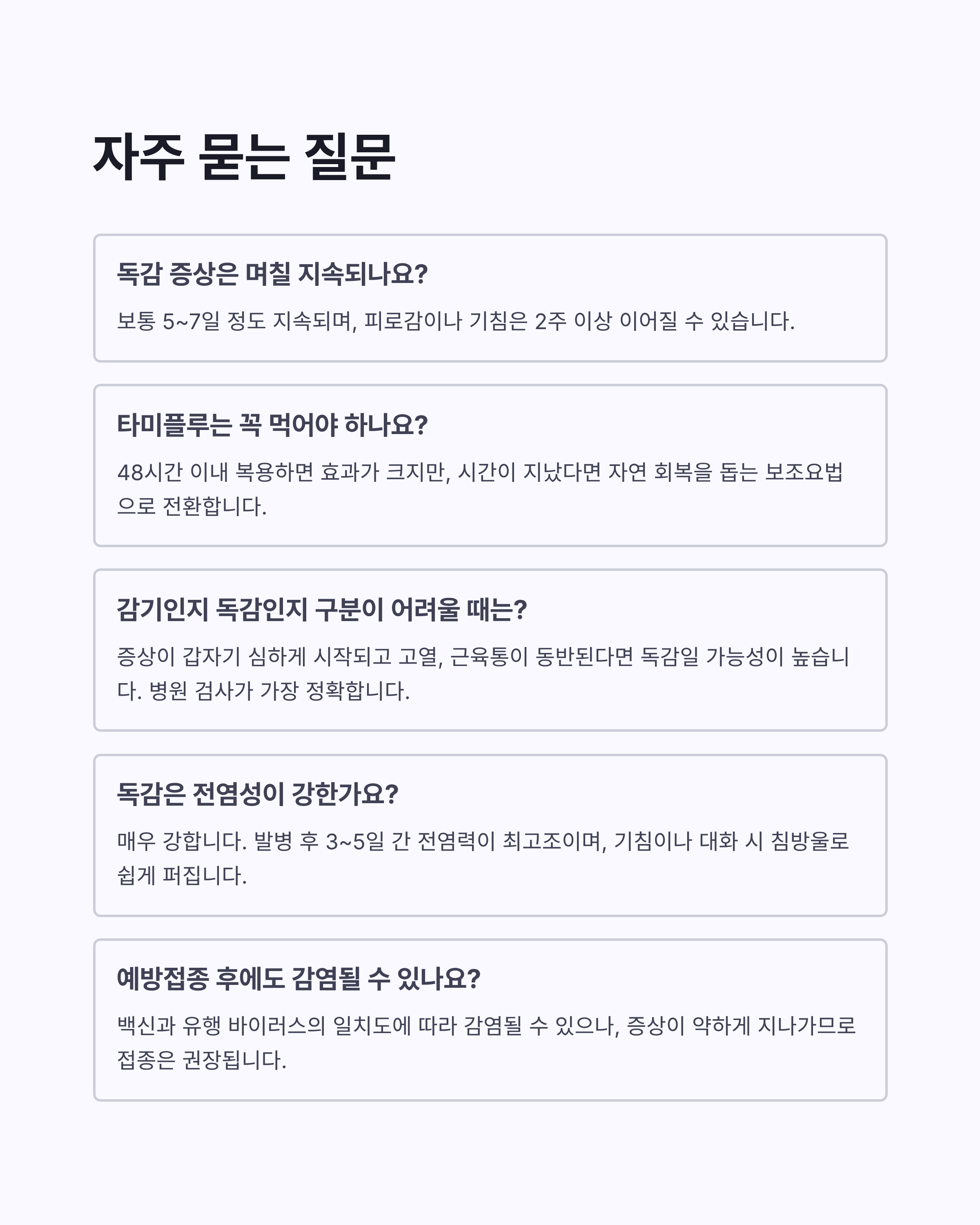 독감은 비말 감염을 통해 전염되므로, 최소 5일간은 타인과의 접촉을 최소화하세요. 특히 유아, 노인, 기저질환자는 고위험군입니다.