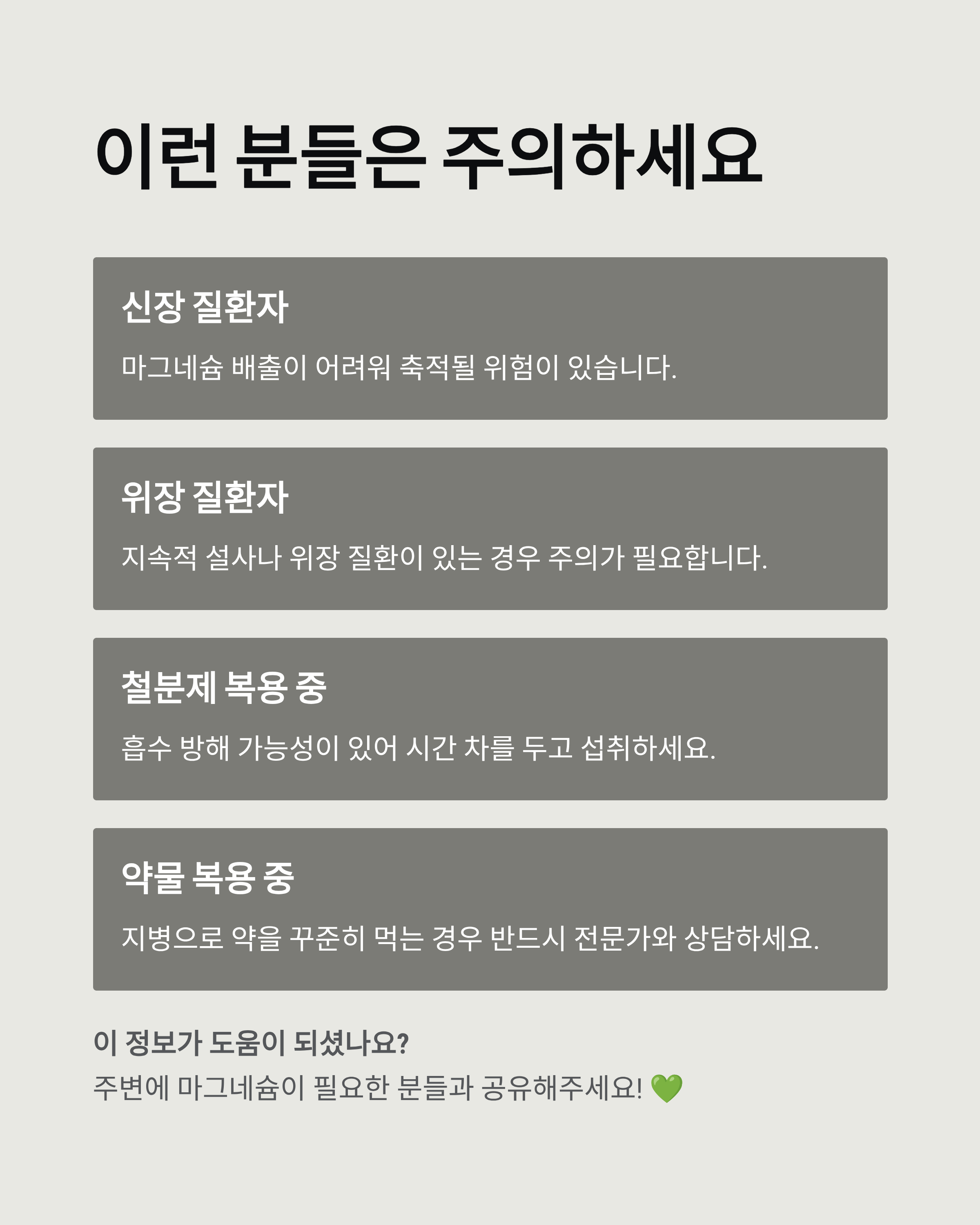 - 구연산마그네슘, 글리시네이트 등 흡수 잘 되는 형태 선택