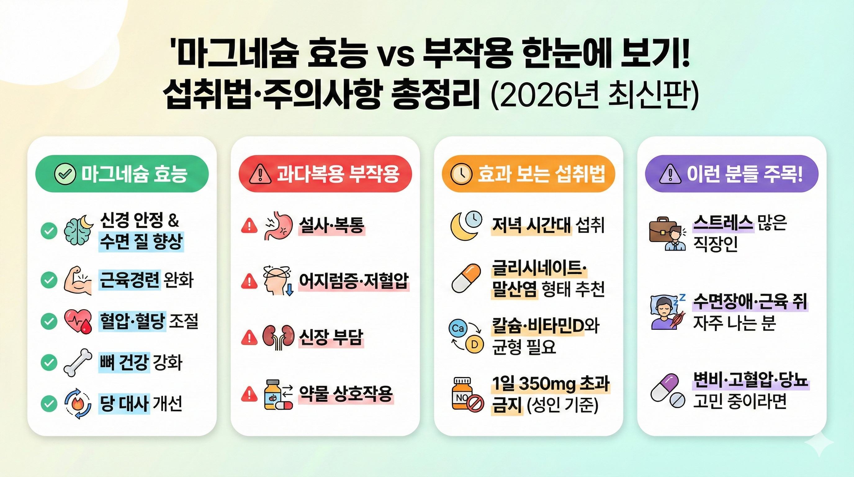 ⚠ 마그네슘 부작용 및 주의사항 (2026년 최신 기준)