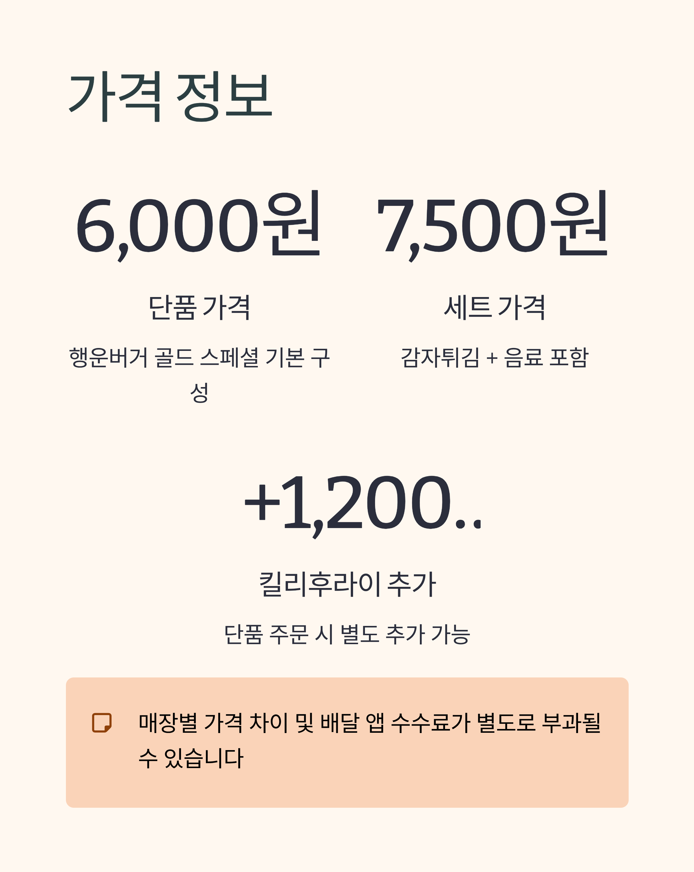 ※ 일부 매장에 따라 가격 차이가 있을 수 있으며, 배달 앱에서는 별도 수수료가 부과될 수 있다.