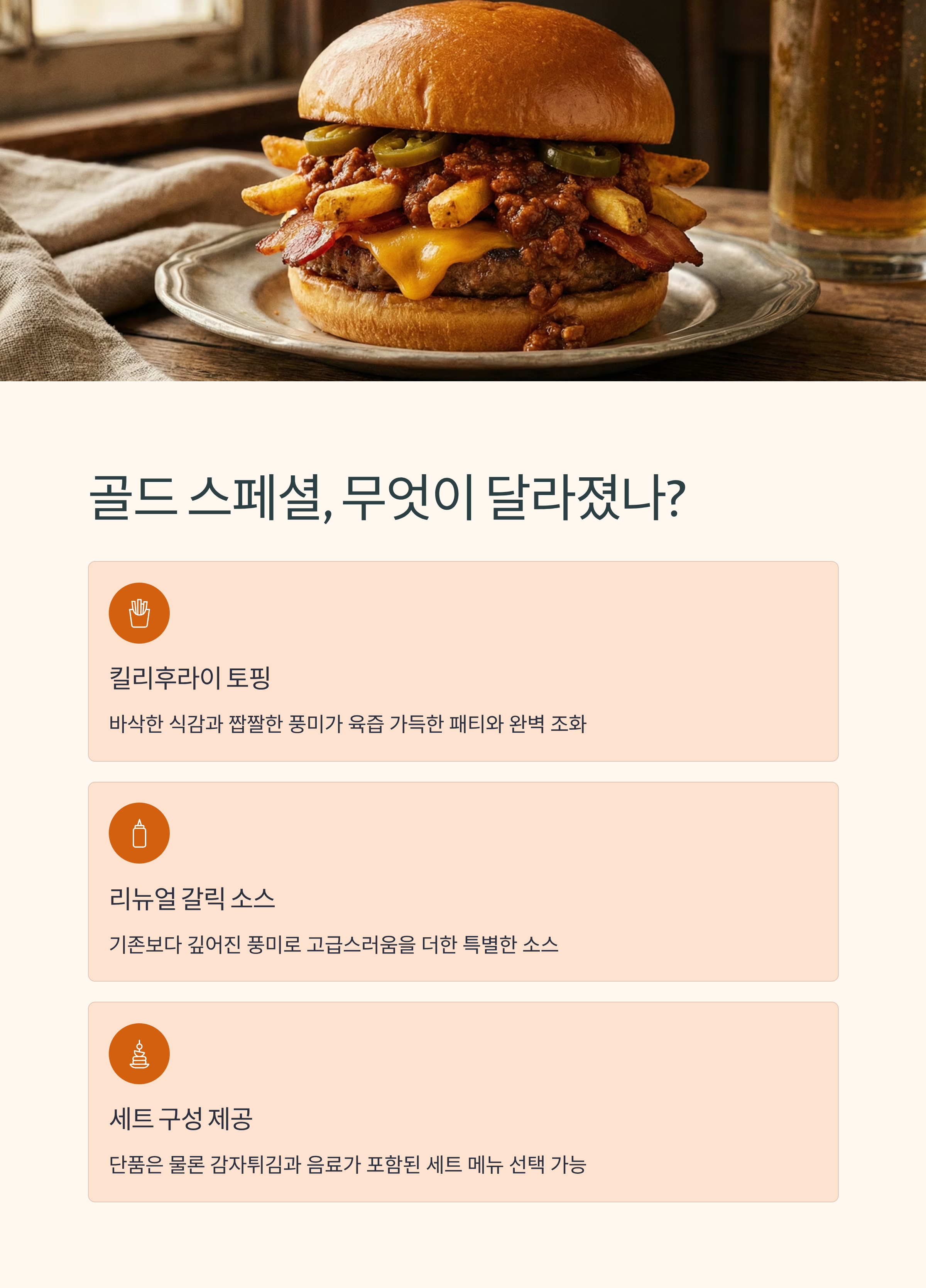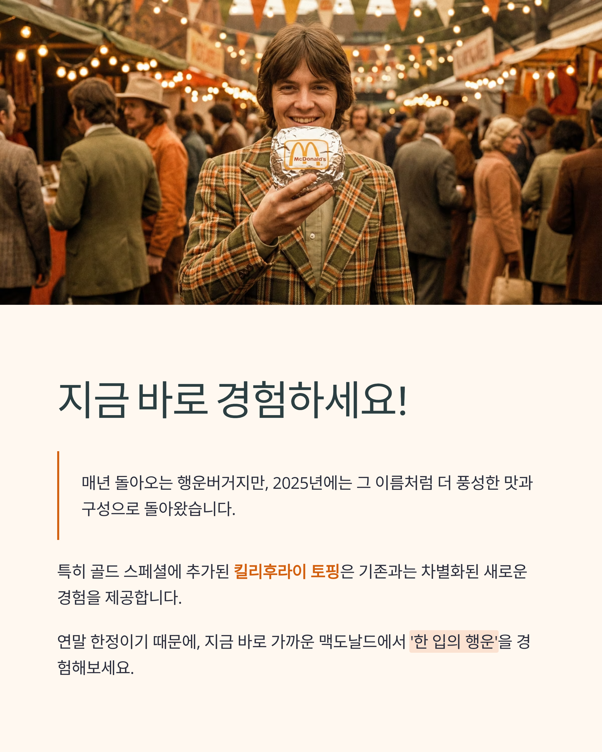 매년 돌아오는 행운버거지만, 2025년에는 그 이름처럼 더 풍성한 맛과 구성으로 돌아왔다. 특히 골드 스페셜에 추가된 킬리후라이 토핑은 기존과는 차별화된 새로운 경험을 제공한다.