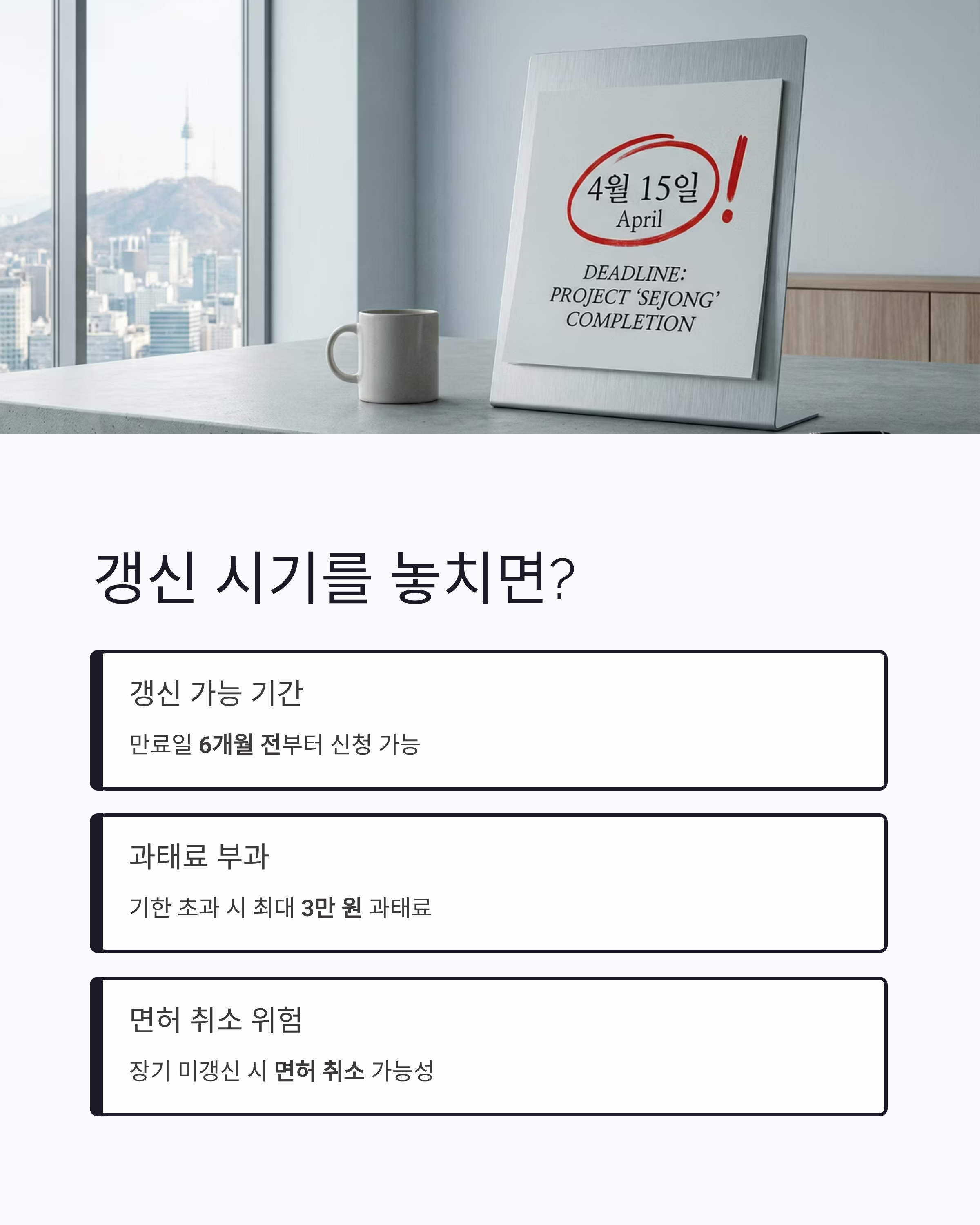 - 기한 넘기면? 과태료 최대 3만 원, 장기 미갱신 시 면허 취소까지 될 수 있어요!