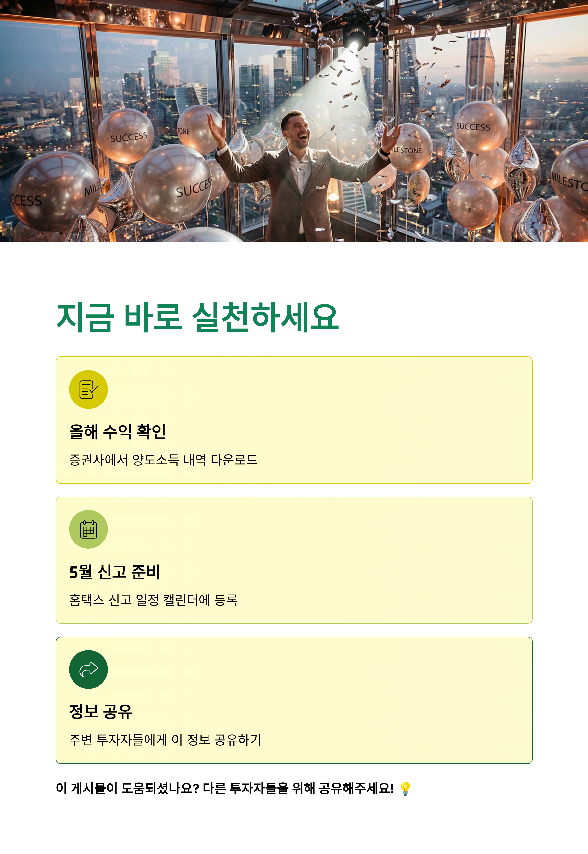 양도소득세와 배당소득세 구조를 제대로 이해하고, 매년 5월에는 꼭 홈택스에서 신고 여부를 확인하는 습관이 중요합니다.
