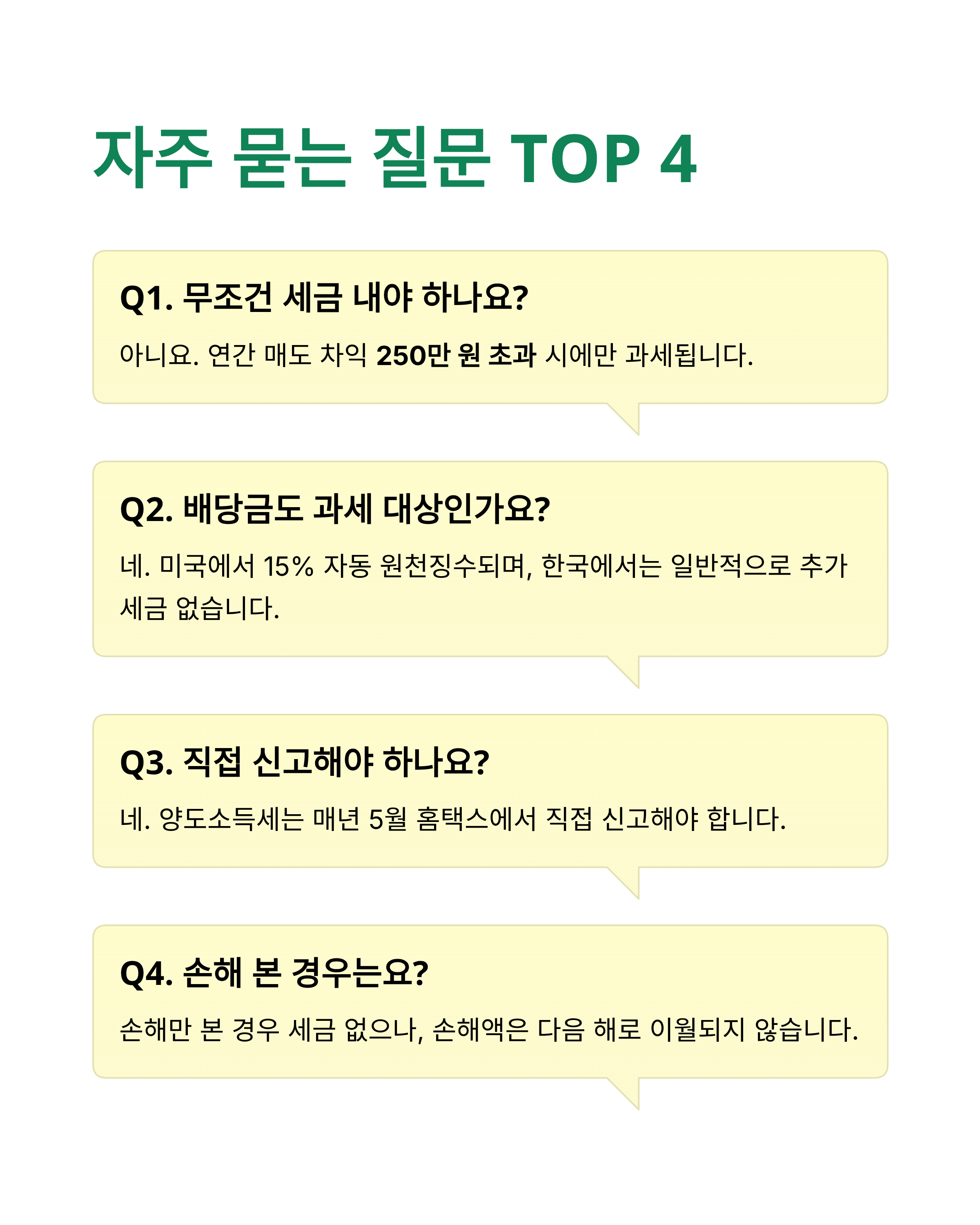 "배당소득세는 얼마나?", "매도차익에도 세금이 붙나?", "직접 신고해야 하나?" 등 다양한 질문들이 쏟아지곤 하죠.