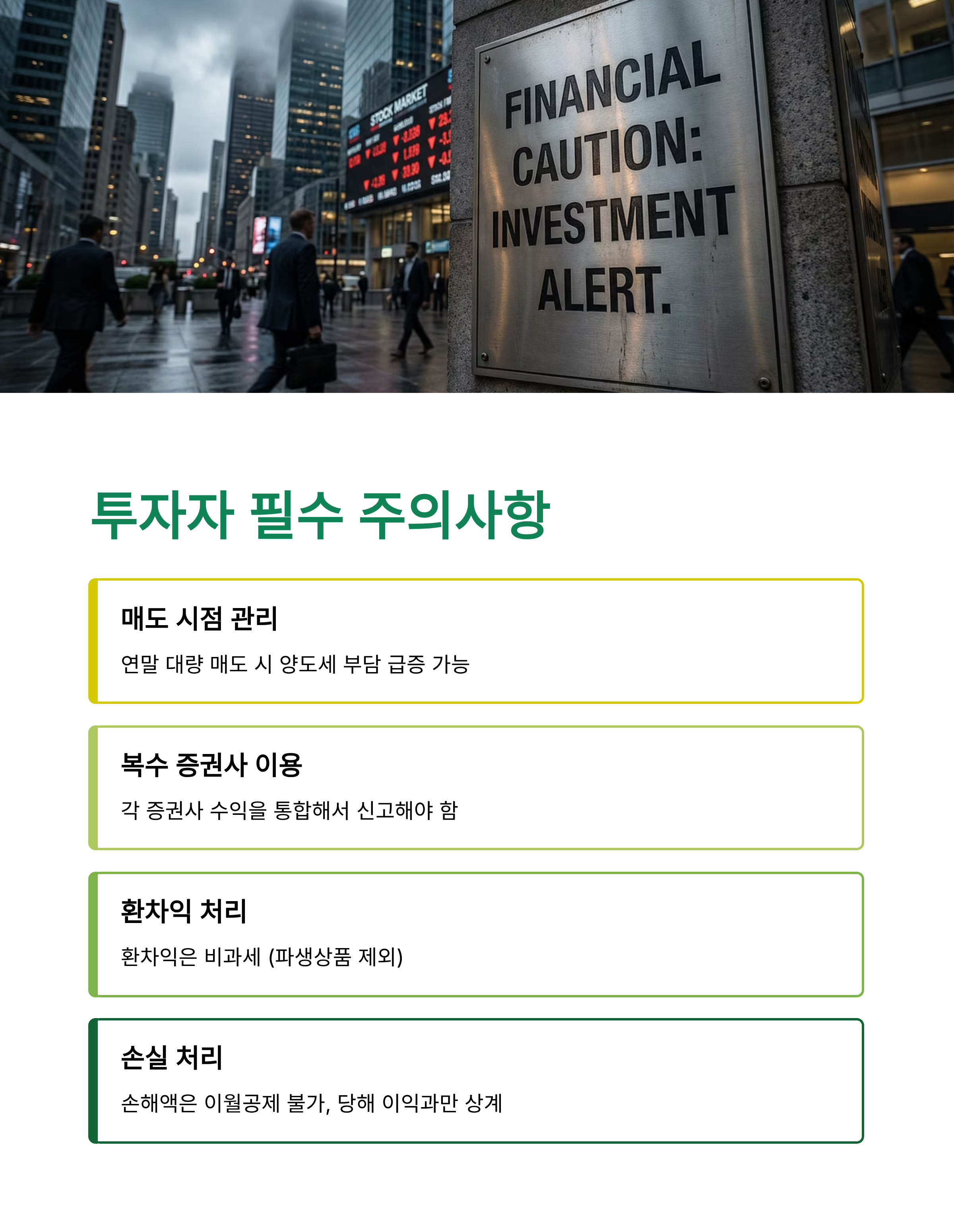 | 주식 매도 시점 | 연말에 대량 매도하면 양도세 부담 급증 가능성 |